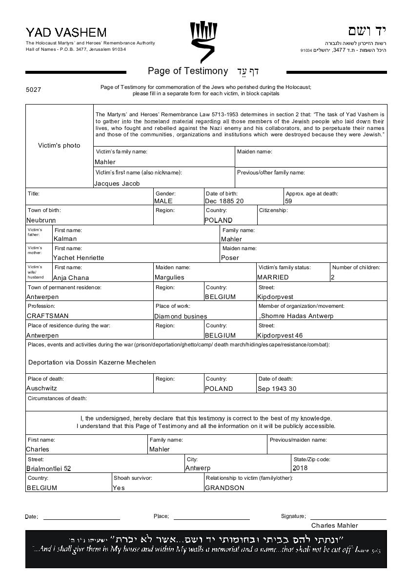 Jacob Mahler wurde im Jahr 1885 in Neubrunn, Deutsches Reich geboren. Er war der Sohn von Kalman und Henriette Yachet, geb. Poser. Er war Handwerker und mit Chana Anja, geb. Margulies Verheiratet. Vor dem Zweiten Weltkrieg lebte er in Antwerpen, Belgien. Während des Krieges war er in Antwerpen, Belgien.