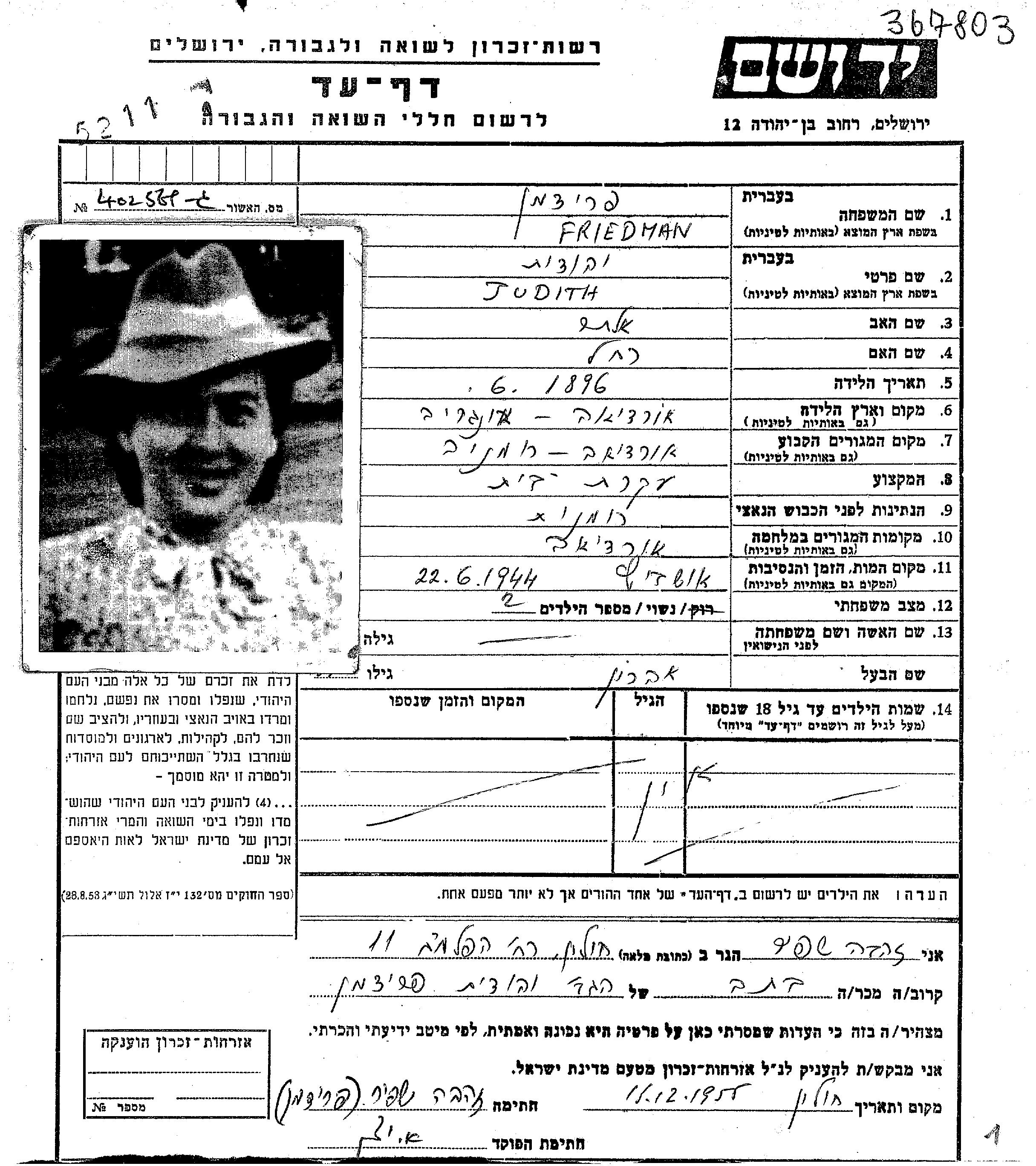 Judith Friedman wurde im Jahr 1896 in Oradea, Rumänien geboren. Sie war die Tochter von Alter und Rakhel. Sie war Hausfrau und mit Aharon Verheiratet. Vor dem Zweiten Weltkrieg lebte sie in Oradea, Rumänien. Während des Krieges war sie in Oradea, Rumänien.