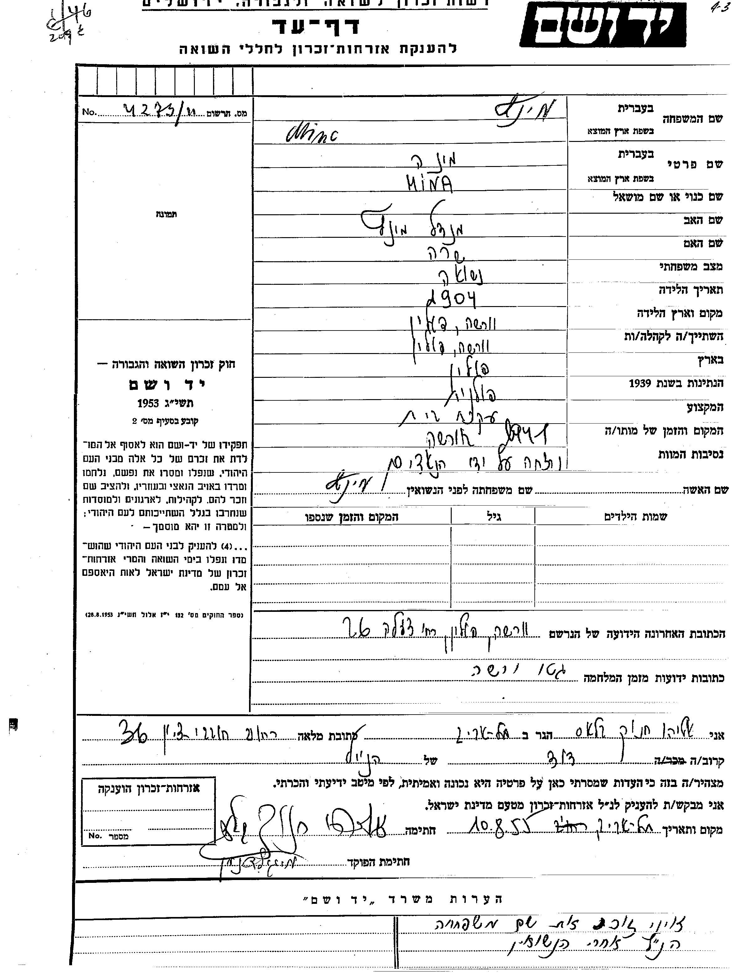 Mina Name unbekannt, geb. Minc wurde im Jahr 1904 in Warszawa, Polen geboren. Sie war die Tochter von Mendel und Sara. Sie war Hausfrau und Verheiratet. Vor dem Zweiten Weltkrieg lebte sie in Warszawa, Polen. Während des Krieges war sie in Warszawa, Polen.