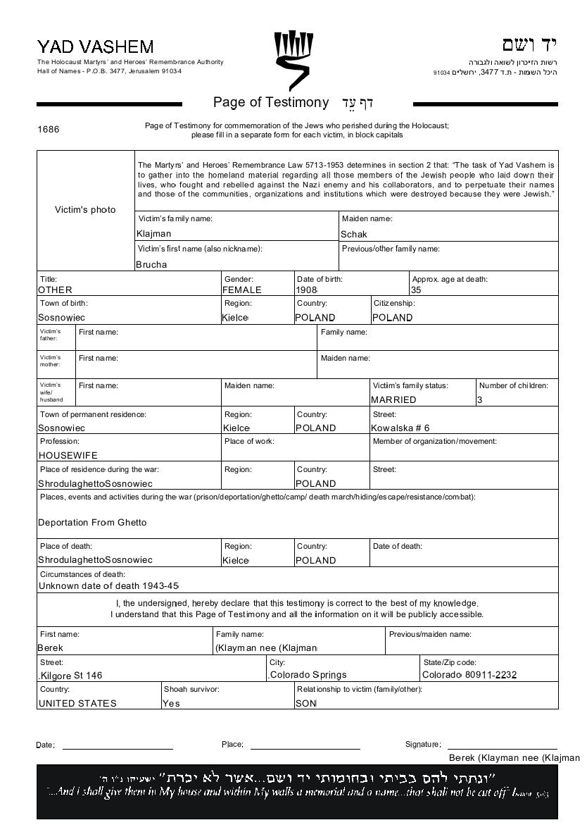 Brucha Klajman, geb. Schak wurde im Jahr 1908 in Sosnowiec, Polen geboren. Sie war Hausfrau und Verheiratet. Vor dem Zweiten Weltkrieg lebte sie in Sosnowiec, Polen. Während des Krieges war sie in Sosnowiec Srodula, Polen.