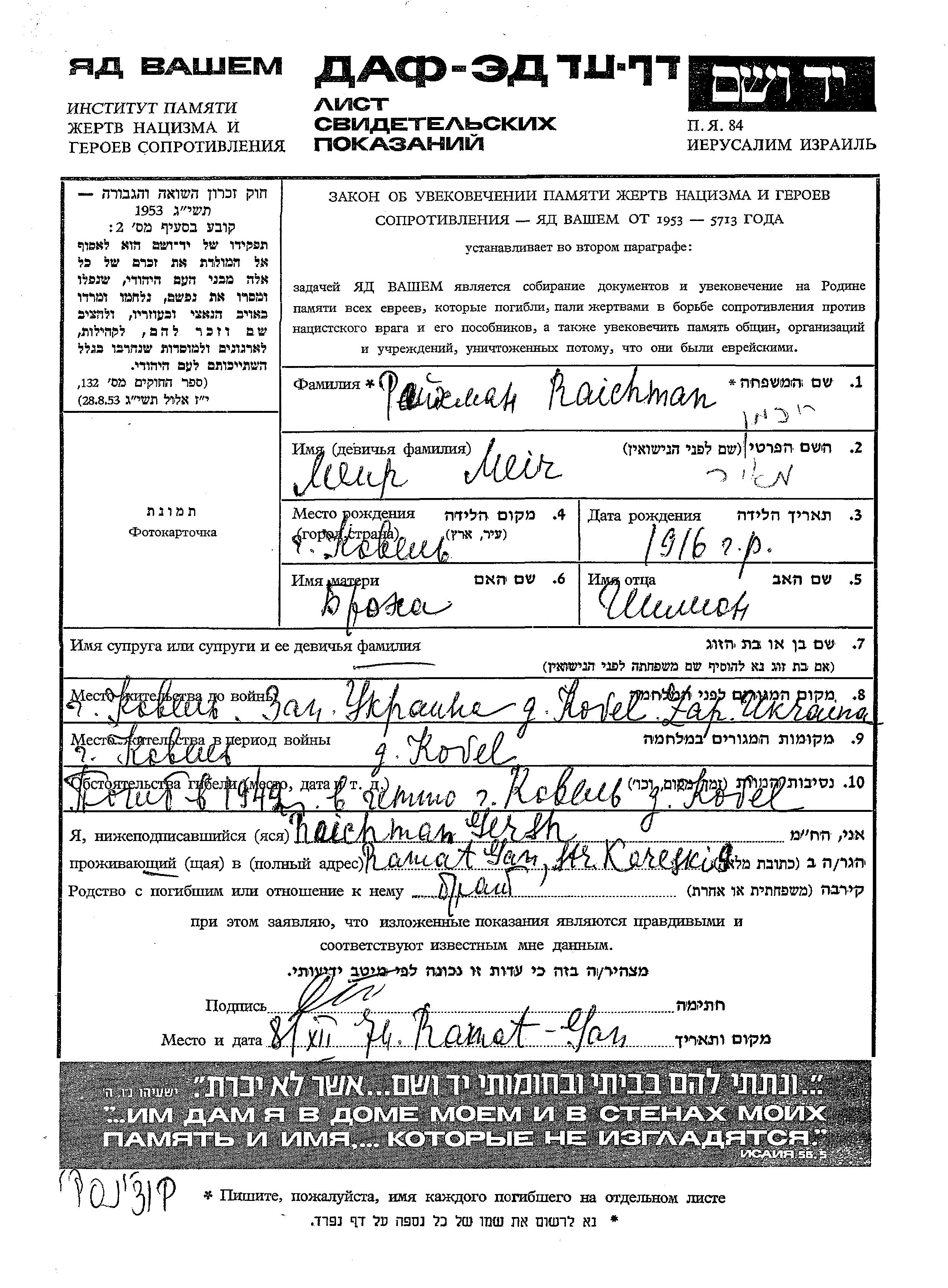 Meir Raichman wurde im Jahr 1916 in Kovel, Polen geboren. Er war der Sohn von Shimon und Brokha. Vor dem Zweiten Weltkrieg lebte er in Kovel, Polen. Während des Krieges war er in Kovel, Polen.