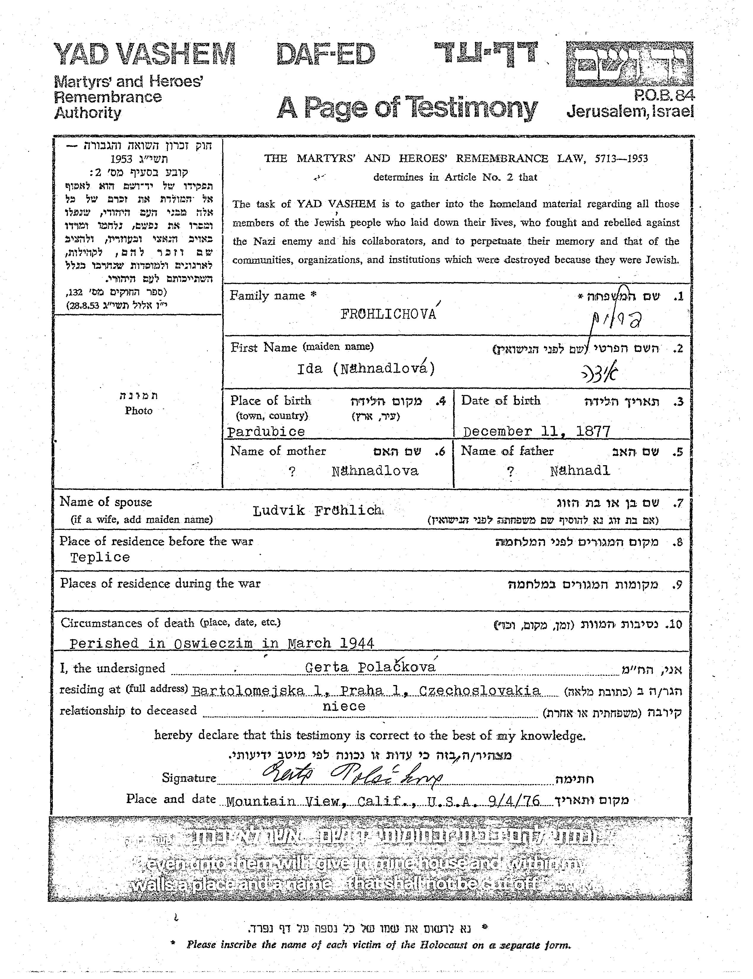 Ida Frohlichova, geb. Nahnadlova wurde im Jahr 1877 in Pardubice, Tschechoslowakei geboren. Vor dem Zweiten Weltkrieg lebte sie in Teplice, Tschechoslowakei.