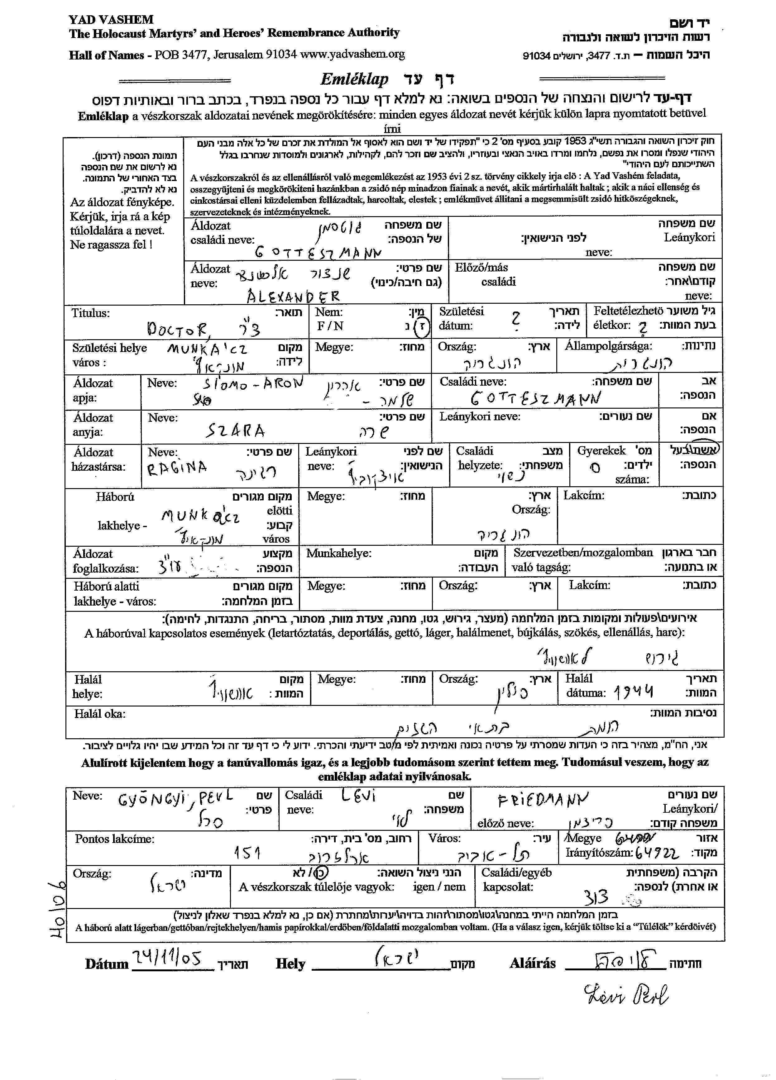 Aleksander Gotesman wurde in Munkacz, Tschechoslowakei geboren. Er war der Sohn von Siomo Shlomo Aharon und Szara. Er war Rechtsanwalt/rechtsanwältin und mit Regina, geb. Itzkovitz Verheiratet. Vor dem Zweiten Weltkrieg lebte er in Munkacz, Tschechoslowakei.