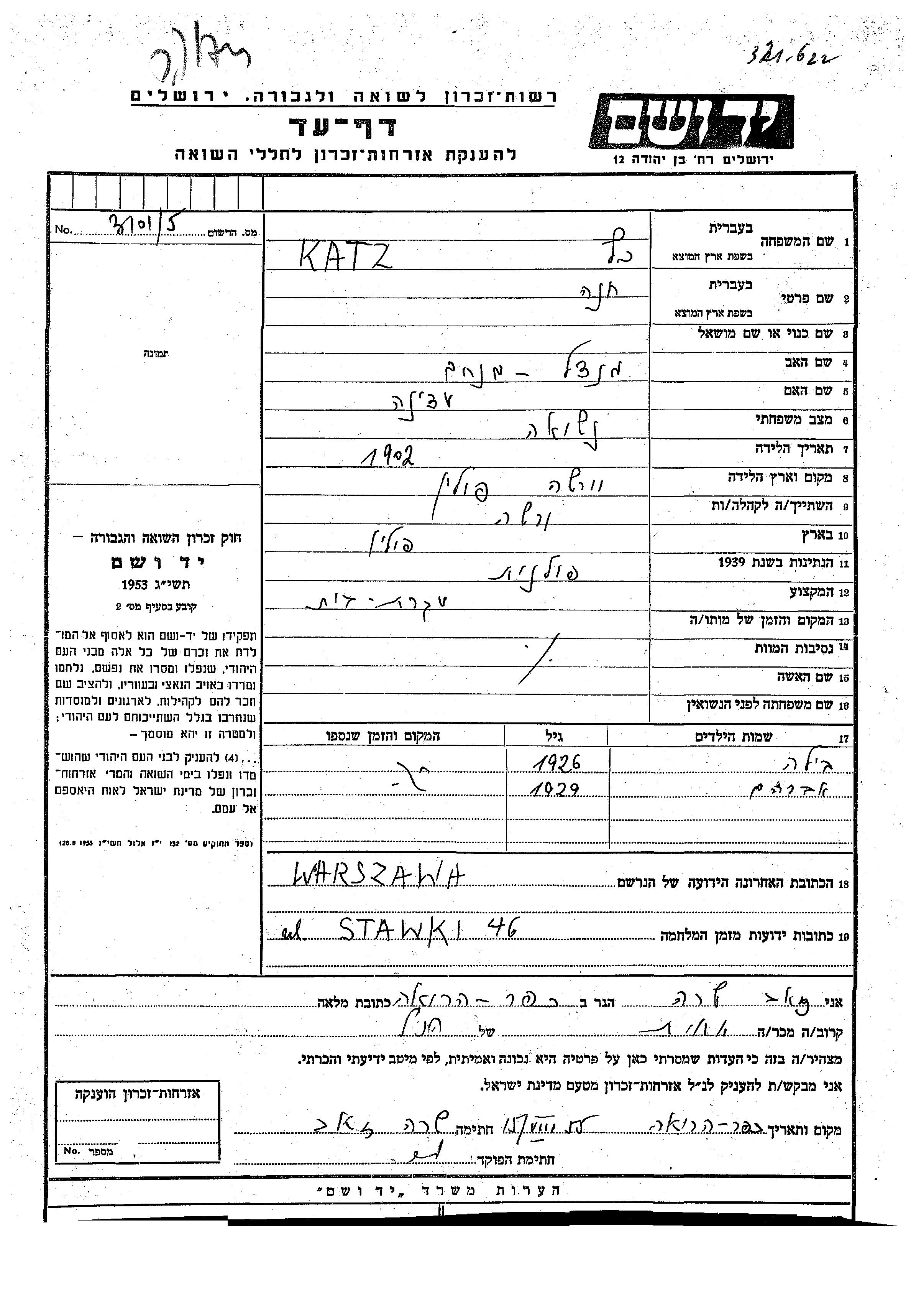 Khana Katz wurde im Jahr 1902 in Varsha, Polen geboren. Sie war die Tochter von Mendel Menakhem und Adina. Sie war Hausfrau und Verheiratet. Vor dem Zweiten Weltkrieg lebte sie in Polen. Während des Krieges war sie in Varsha, Polen.