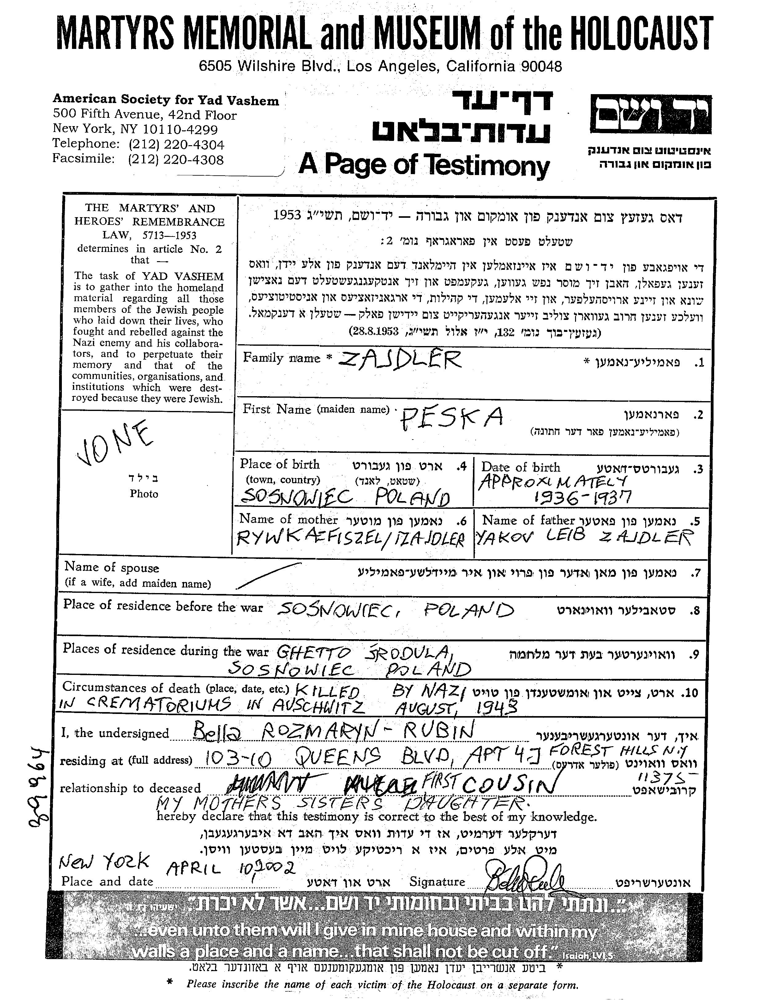 Peska Zajdler wurde im Jahr 1937 in Sosnowiec, Polen geboren. Sie war die Tochter von Leib Yakov und Rywka, geb. Fiszel. Sie war Kind. Vor dem Zweiten Weltkrieg lebte sie in Sosnowiec, Polen. Während des Krieges war sie in Sosnowiec Srodula, Polen.