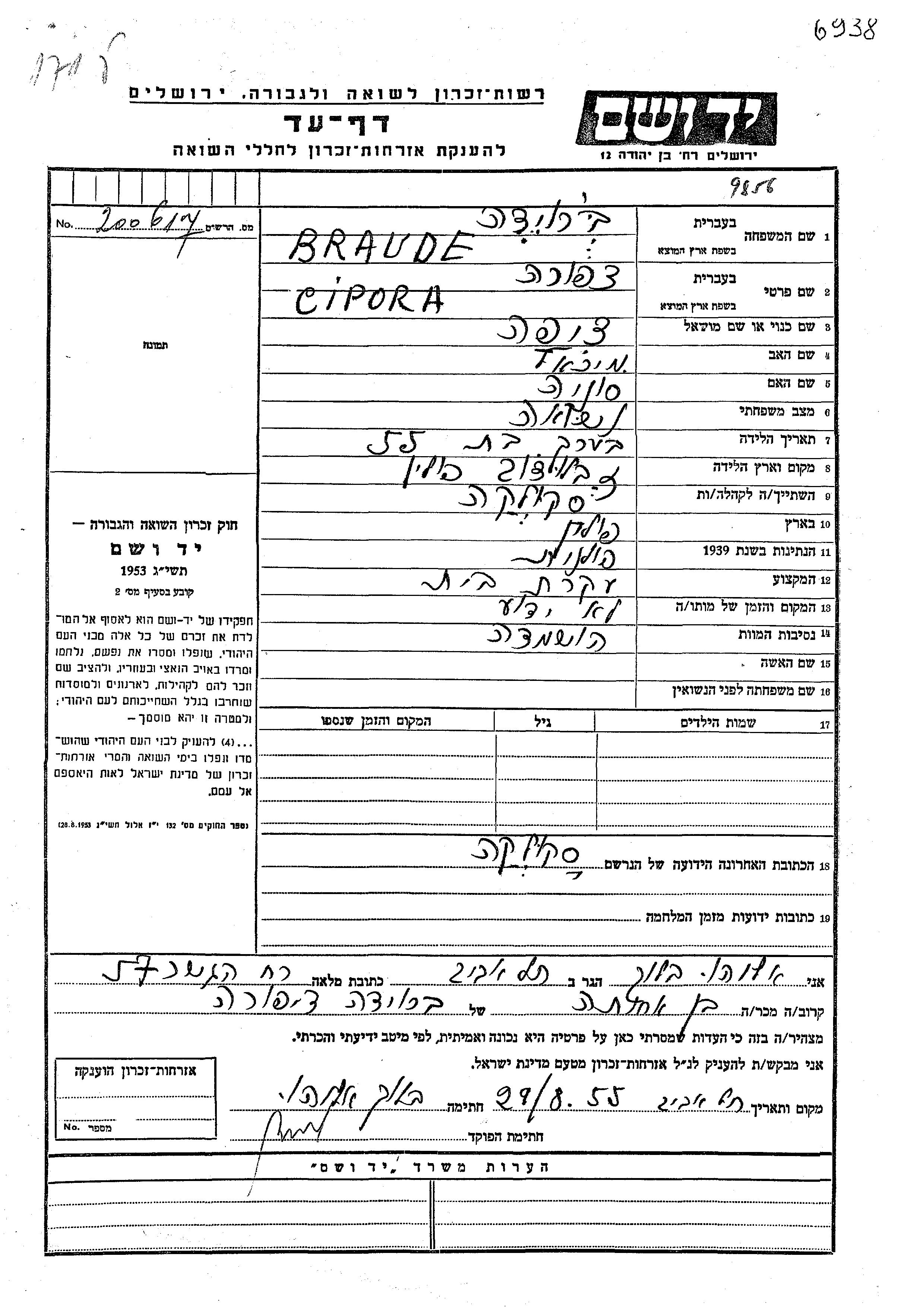 Braude Cipora Sokolka, Polen Gedenkblatt
