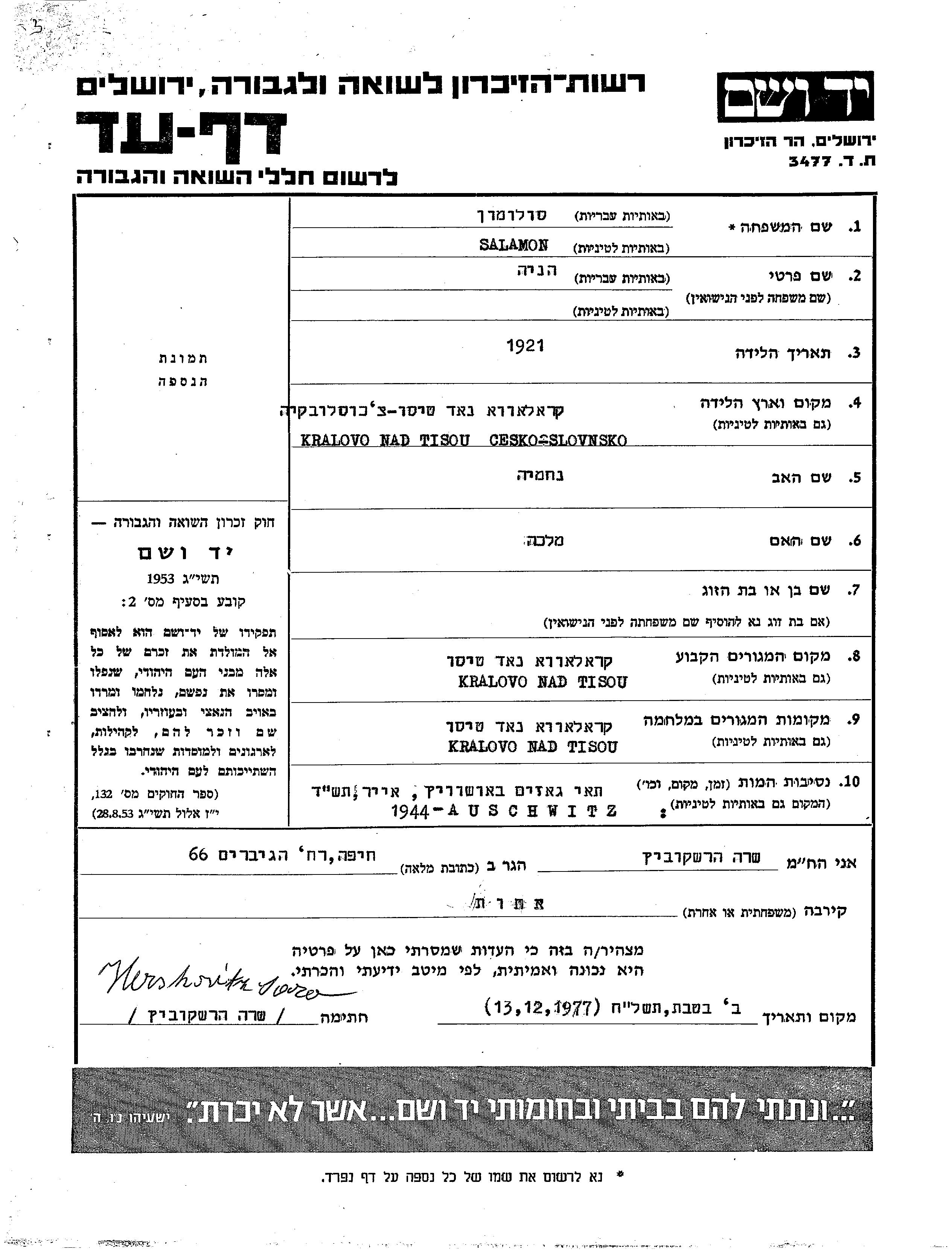 Henia Salamon Solomon wurde im Jahr 1921 in Kralovo nad Tisou, Tschechoslowakei geboren. Sie war die Tochter von Nekhemia und Malka. Vor dem Zweiten Weltkrieg lebte sie in Kralovo nad Tisou, Tschechoslowakei. Während des Krieges war sie in Kralovo nad Tisou, Tschechoslowakei.