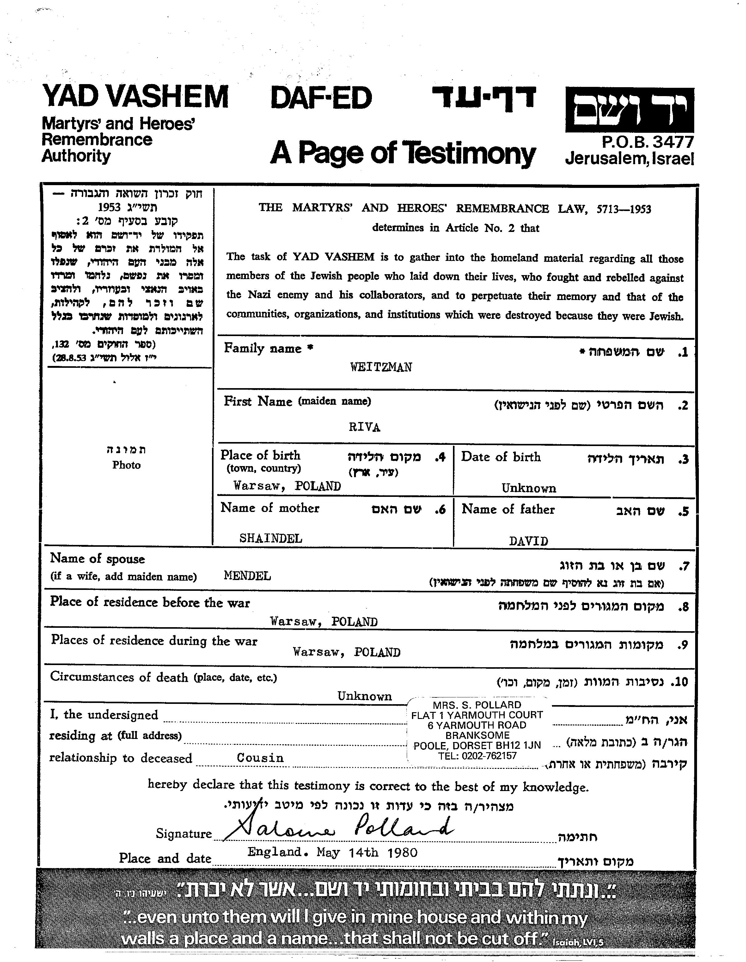 Weitzman Riva Warsaw, Polen Gedenkblatt