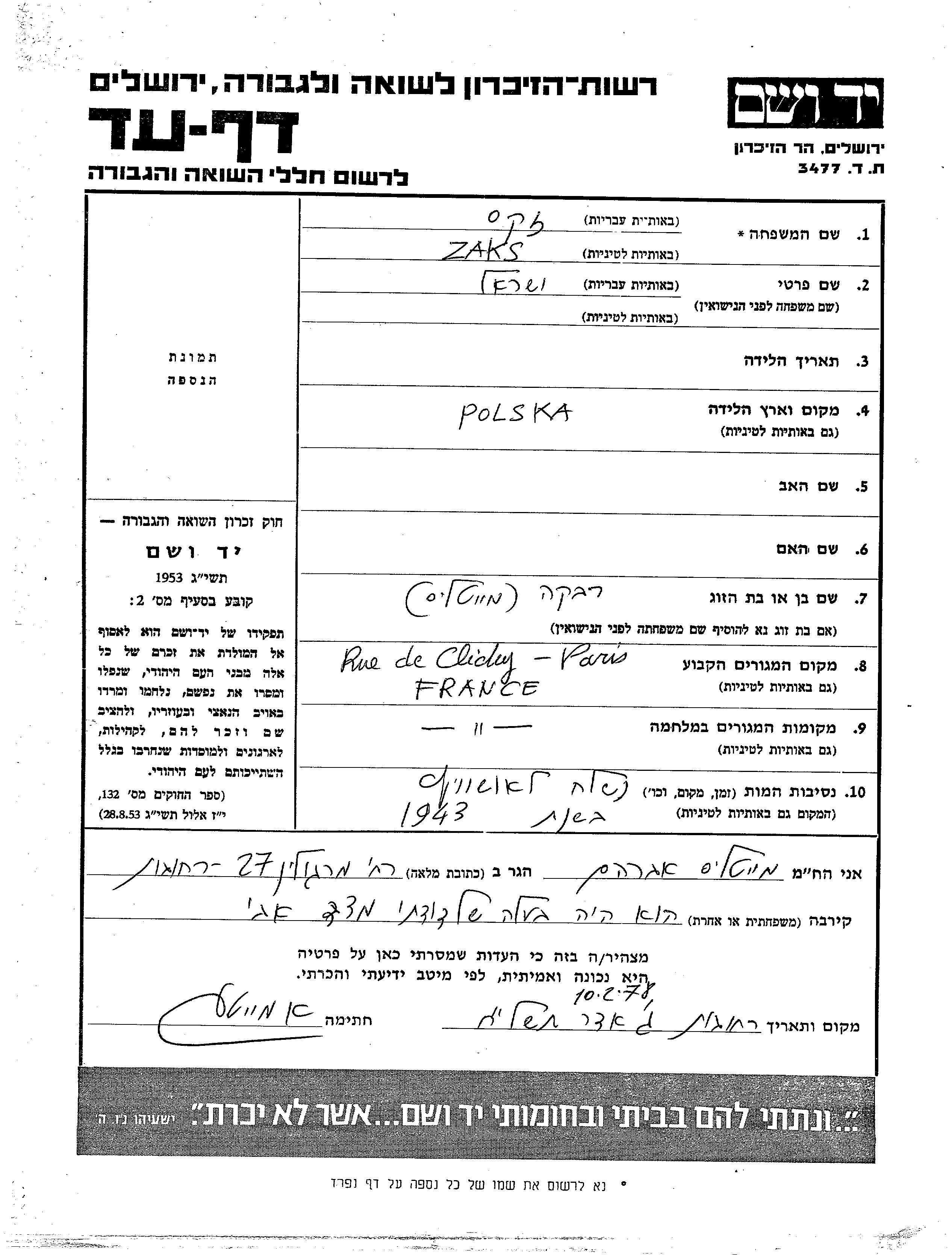 Zaks Yisrael Paris, Frankreich Gedenkblatt