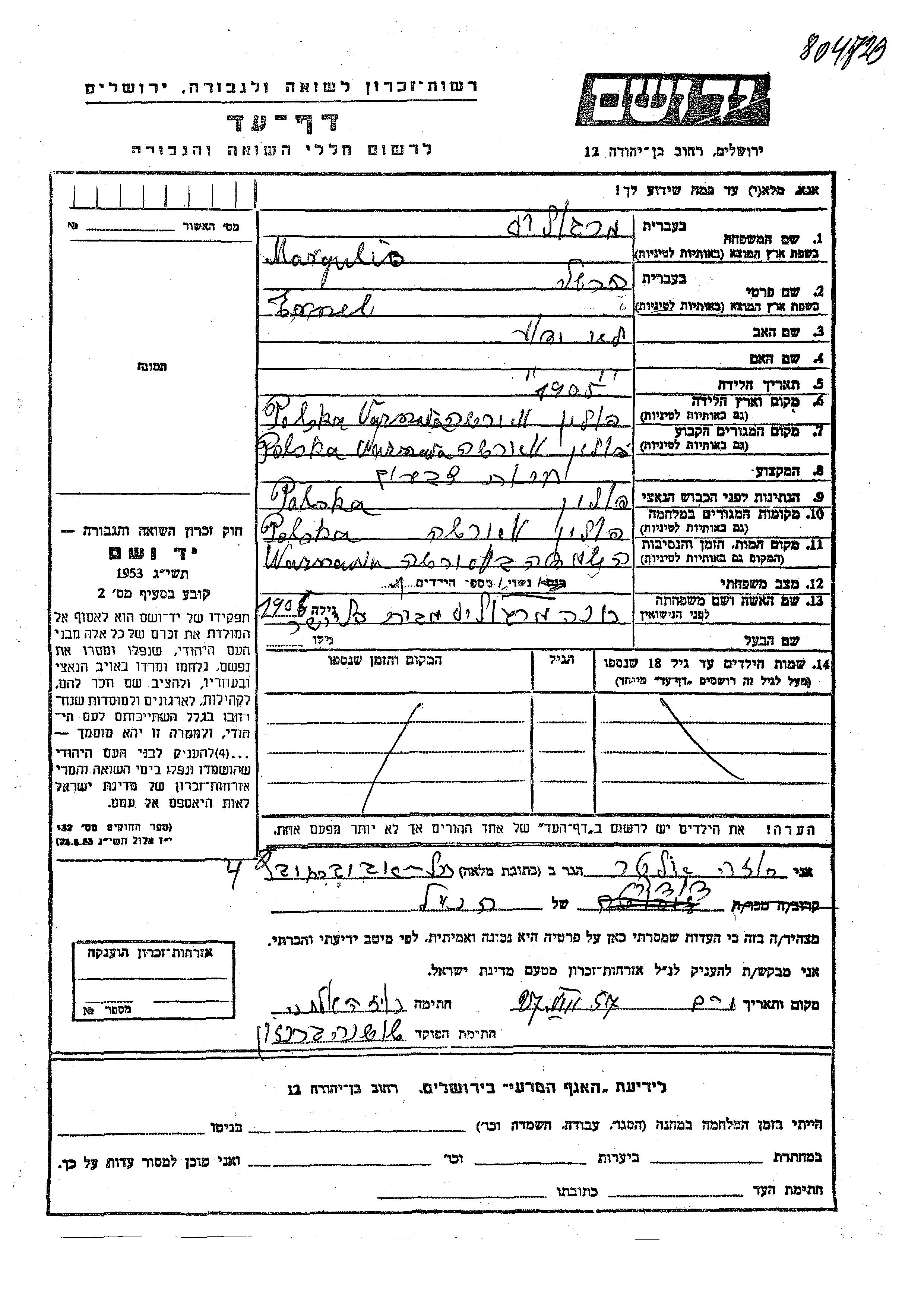 Ersel Margulis wurde im Jahr 1905 in Warsaw, Polen geboren. Er war mit Khana, geb. Fleisher Verheiratet. Vor dem Zweiten Weltkrieg lebte er in Warsaw, Polen. Während des Krieges war er in Warsaw, Polen.