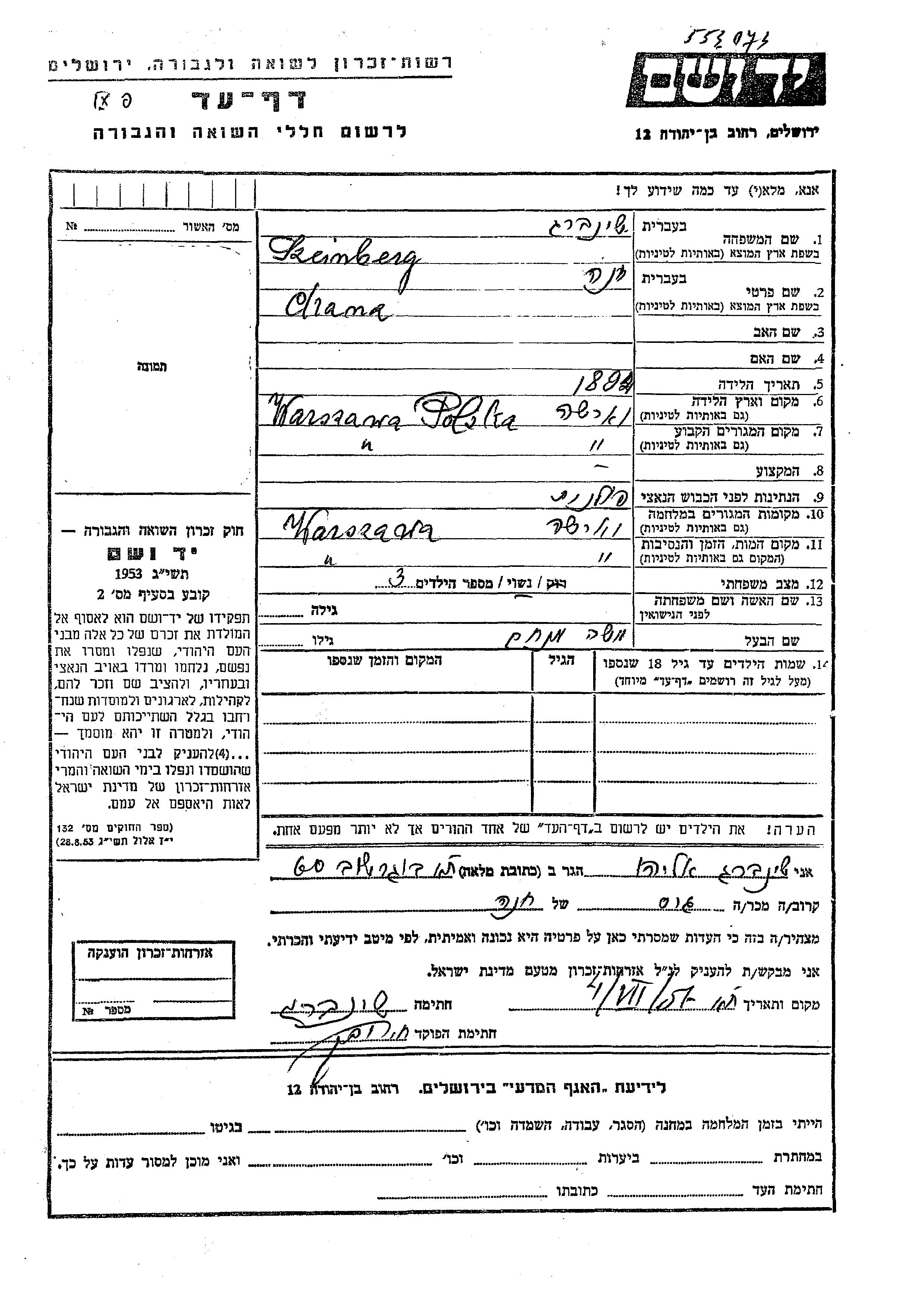 Chana Shinberg wurde im Jahr 1894 in Warszawa, Polen geboren. Sie war mit Moshe Menakhem Verheiratet. Vor dem Zweiten Weltkrieg lebte sie in Warszawa, Polen. Während des Krieges war sie in Warszawa, Polen.