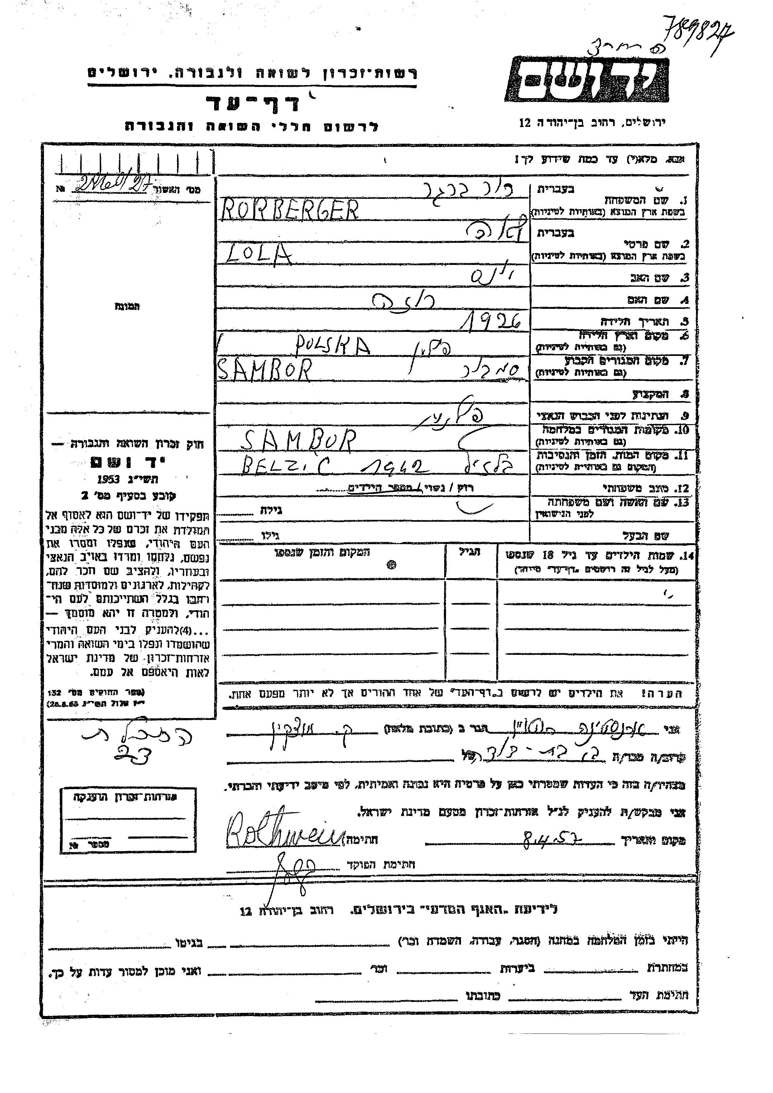 Lola Lea Rorberger wurde im Jahr 1926 in Sambor, Polen geboren. Sie war die Tochter von Ionas und Roza. Sie war Ledig. Vor dem Zweiten Weltkrieg lebte sie in Sambor, Polen. Während des Krieges war sie in Sambor, Polen.