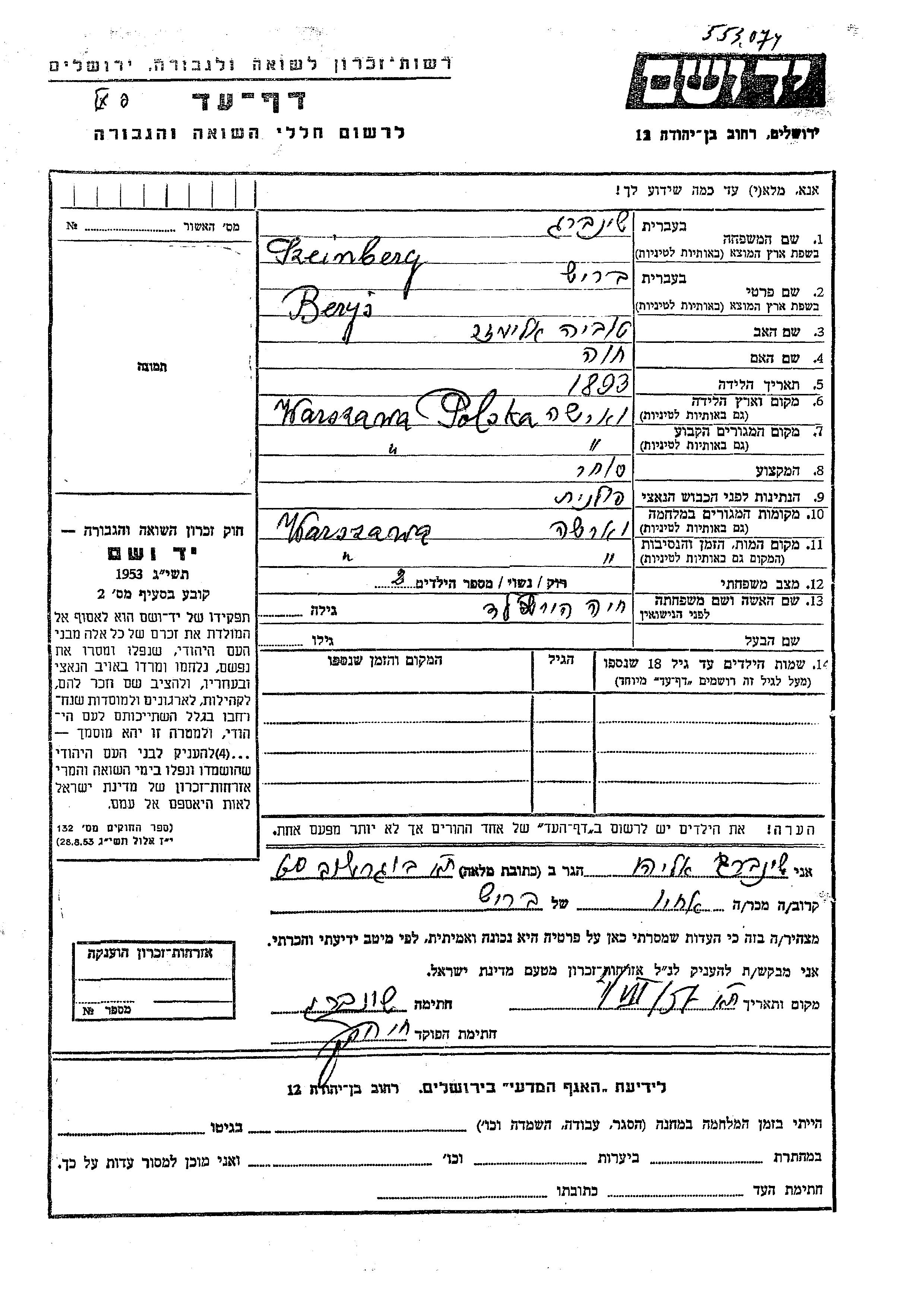 Berys Szeinberg wurde im Jahr 1893 in Warszawa, Polen geboren. Er war der Sohn von Tuvia Eliezer und Khava. Er war Kaufmann/-frau und mit Khaia, geb. Hirshfeld Verheiratet. Vor dem Zweiten Weltkrieg lebte er in Warszawa, Polen. Während des Krieges war er in Warszawa, Polen.