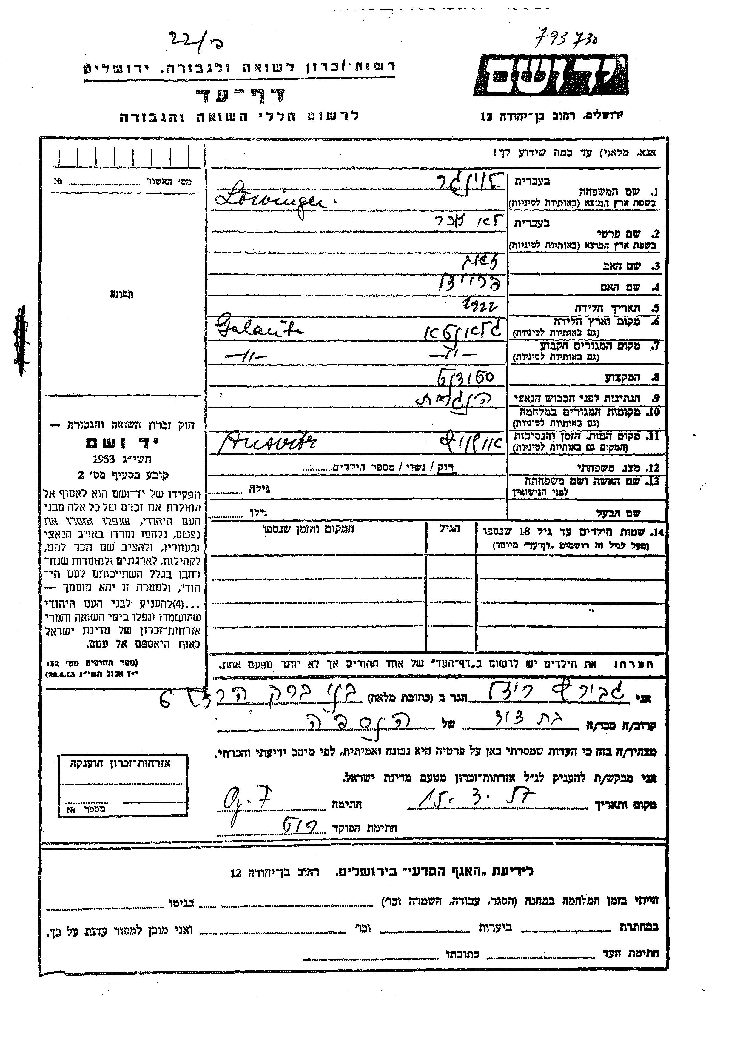 Vorname unbekannt Lowinger wurde im Jahr 1922 in Galanta, Tschechoslowakei geboren. Er war der Sohn von Zeev und Freidel. Er war Student und Ledig. Vor dem Zweiten Weltkrieg lebte er in Galanta, Tschechoslowakei.