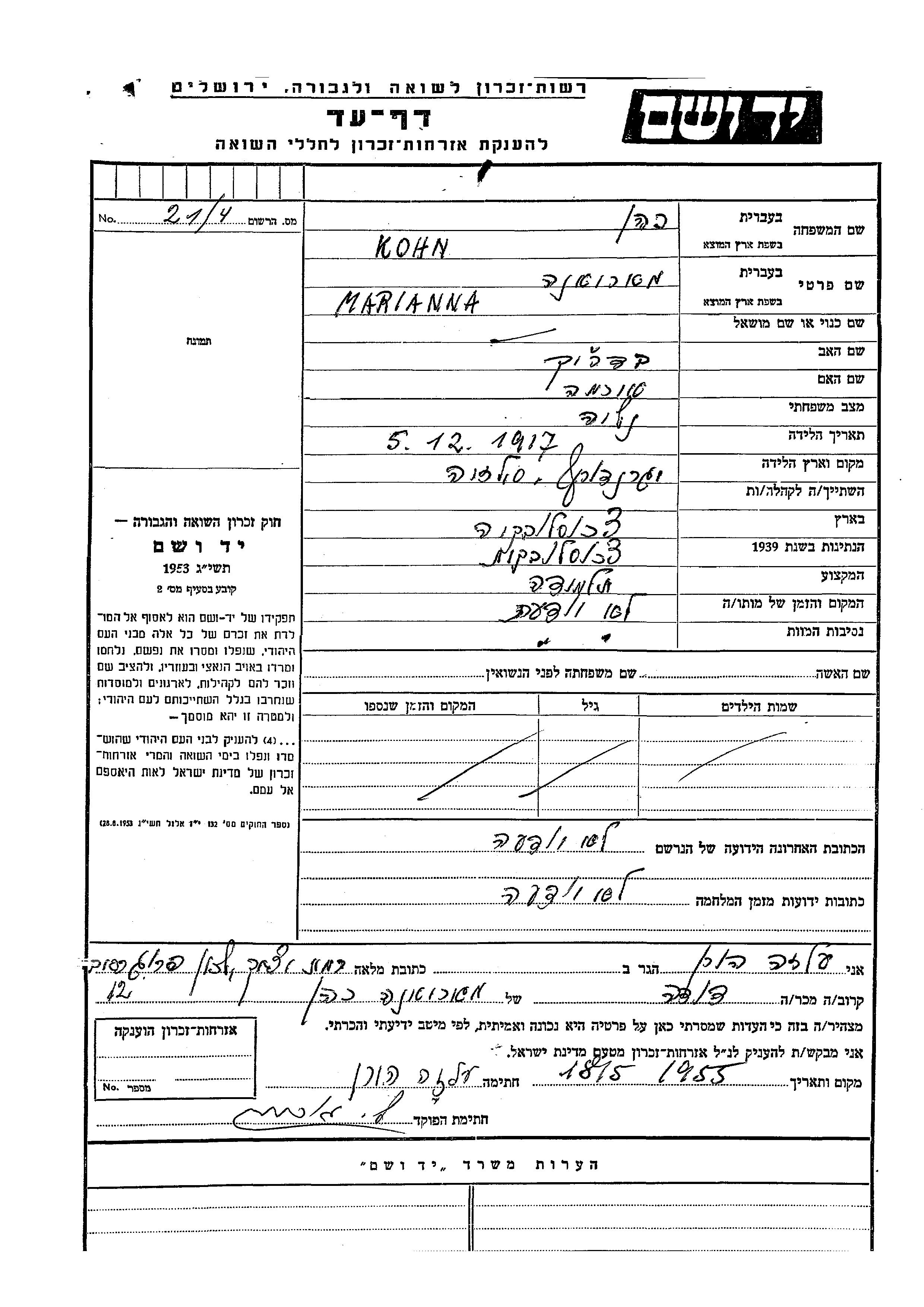 Marianna Kohn wurde im Jahr 1917 in Jegerdorf, Tschechoslowakei geboren. Sie war die Tochter von Bedrikh und Irma. Sie war Schüler/-in und Verheiratet. Vor dem Zweiten Weltkrieg lebte sie in Tschechoslowakei.