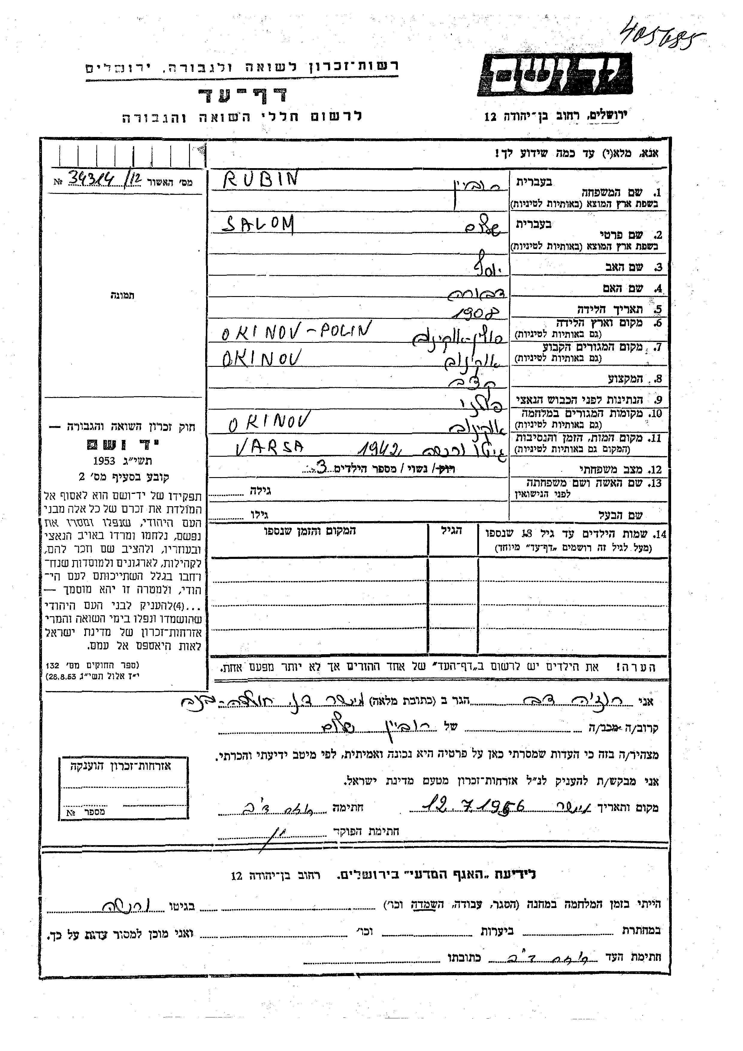 Shalom Rubin wurde im Jahr 1908 in Okinov, Polen geboren. Er war der Sohn von Yosef und Dvora. Er war Metzger/-in und Verheiratet. Vor dem Zweiten Weltkrieg lebte er in Okinov, Polen. Während des Krieges war er in Okinov, Polen.