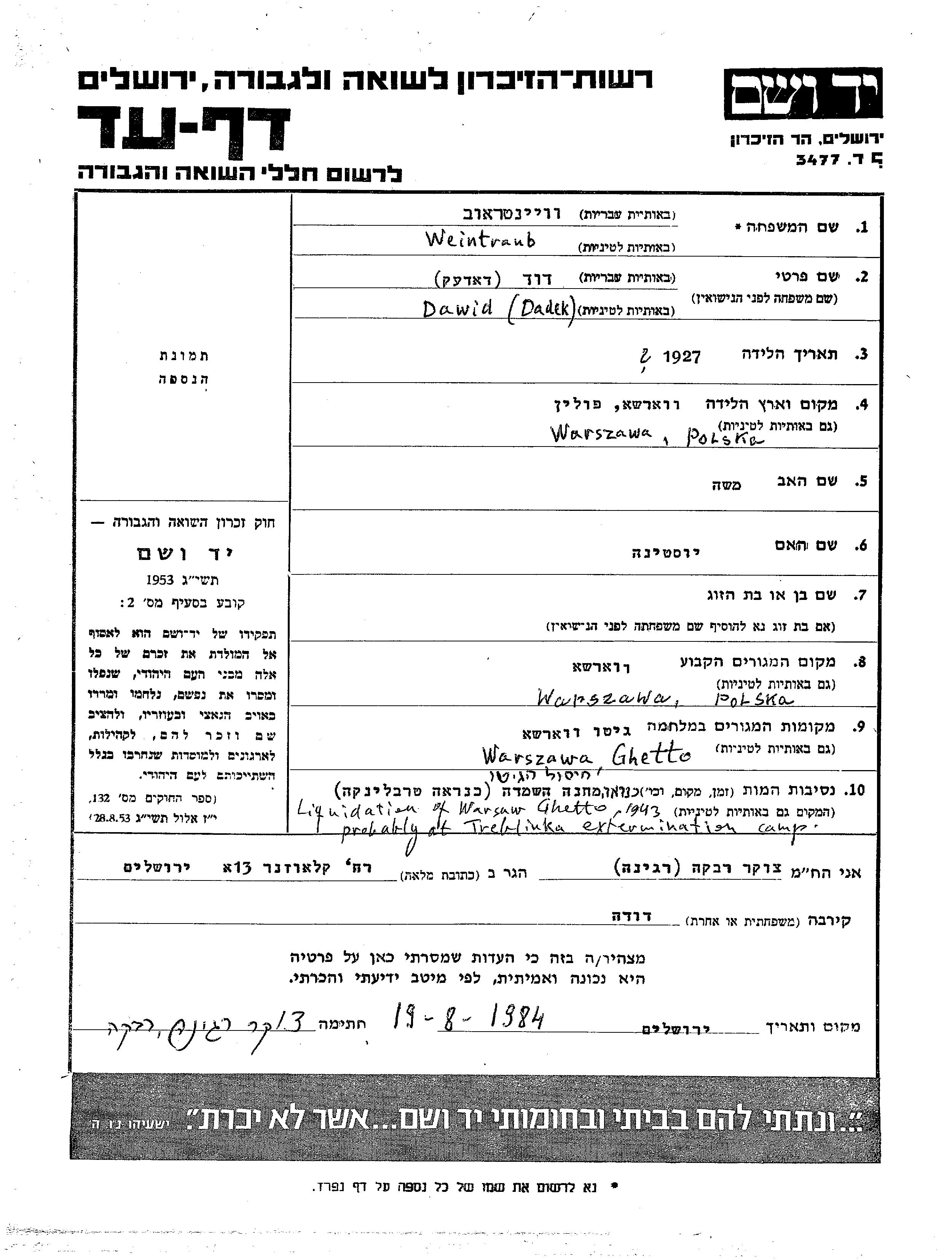 Dawid Weintraub wurde im Jahr 1927 in Varsha, Polen geboren. Er war der Sohn von Moshe und Yustina. Vor dem Zweiten Weltkrieg lebte er in Varsha, Polen. Während des Krieges war er in Warszawa, Polen.