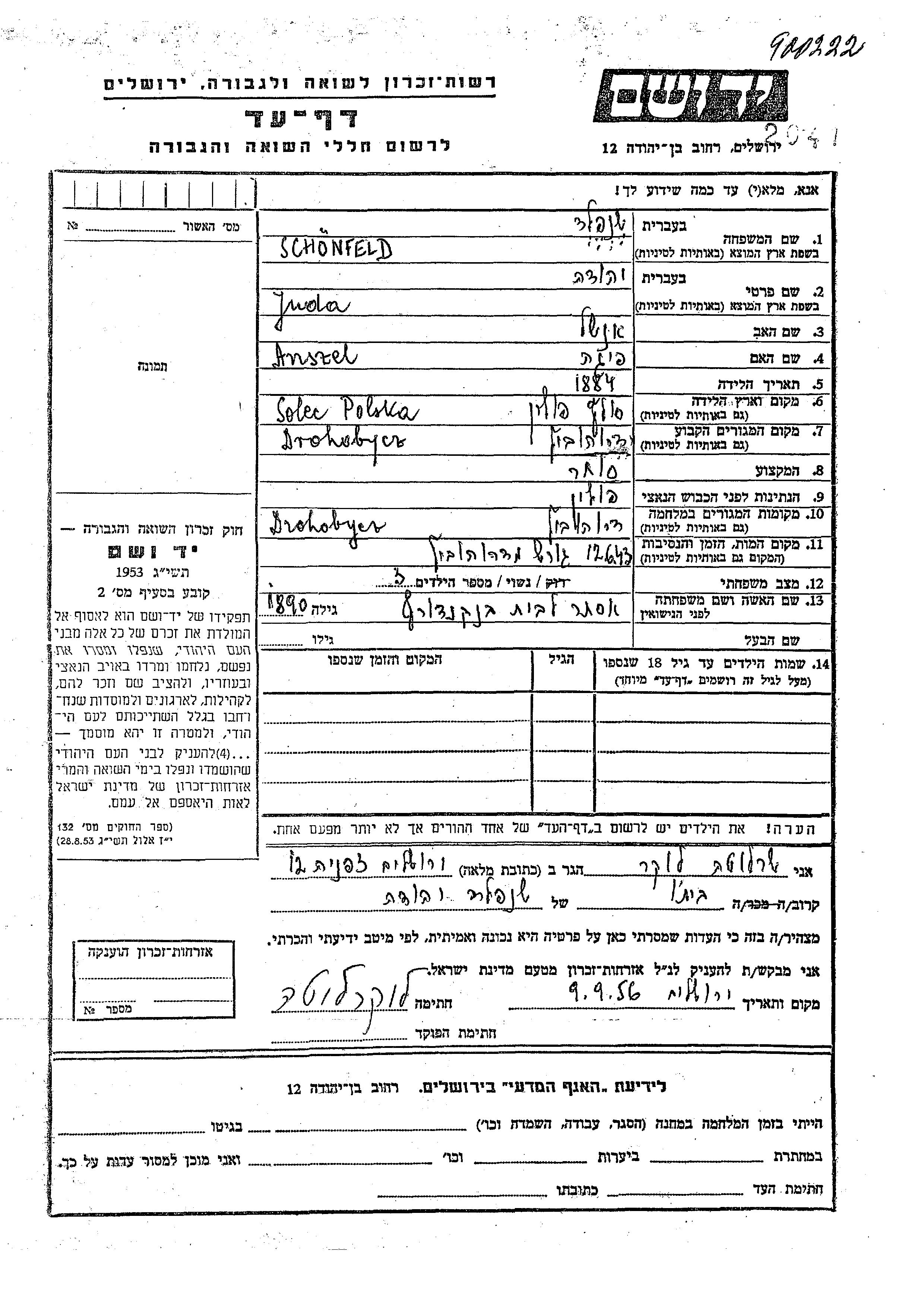 Yuda Schonfeld wurde im Jahr 1884 in Solec, Polen geboren. Er war der Sohn von Anszel und Feiga. Er war Kaufmann/-frau und mit Ester, geb. Benkendorf Verheiratet. Vor dem Zweiten Weltkrieg lebte er in Drohobycz, Polen. Während des Krieges war er in Drohobycz, Polen.