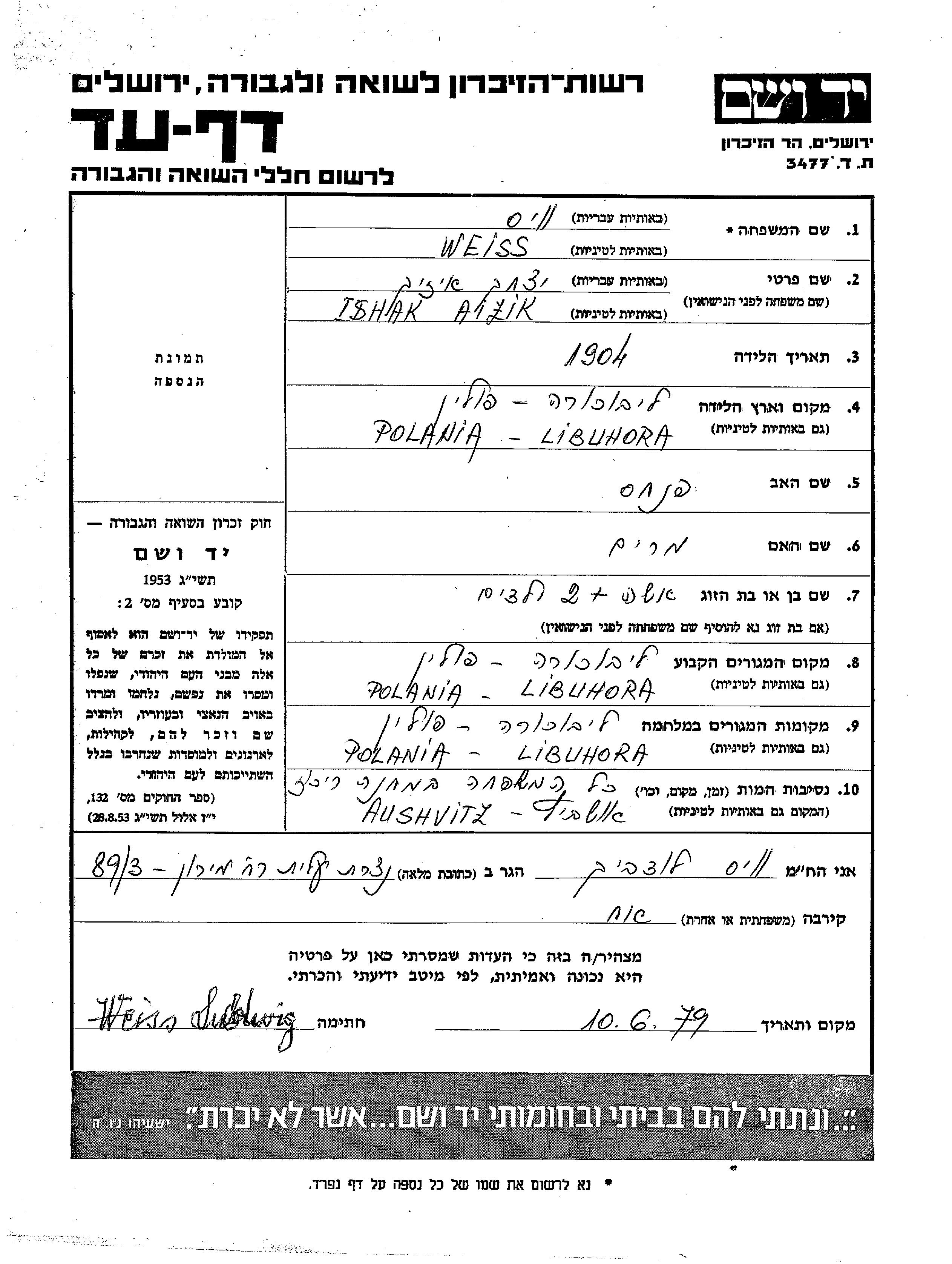 Yitzkhak Weiss wurde im Jahr 1904 in Libuchora, Polen geboren. Er war der Sohn von Pinkhas und Miriam. Er war Verheiratet. Vor dem Zweiten Weltkrieg lebte er in Libuchora, Polen. Während des Krieges war er in Libuchora, Polen.