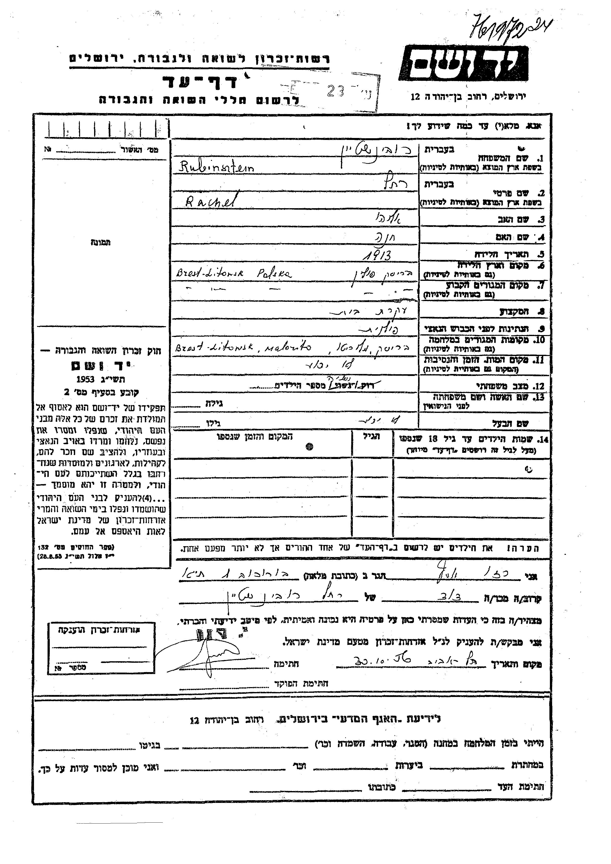 Rachel Rubinsztein wurde im Jahr 1913 in Brest Litowsk, Polen geboren. Sie war die Tochter von Eliahu und Khana. Sie war Hausfrau und Verheiratet. Vor dem Zweiten Weltkrieg lebte sie in Brest Litowsk, Polen. Während des Krieges war sie in Malorita, Polen.