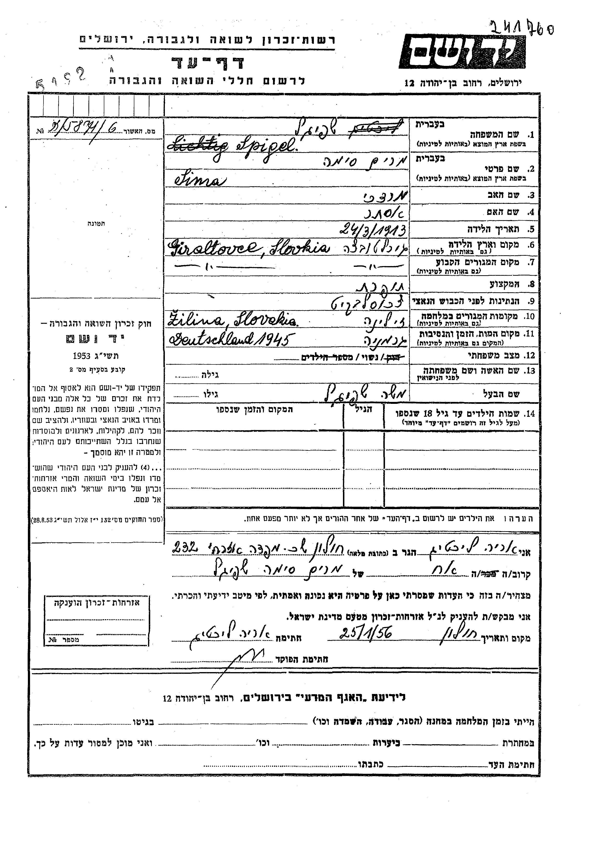 Miriam Sima Spigel wurde im Jahr 1913 in Giraltovce, Tschechoslowakei geboren. Sie war die Tochter von Mordekhai und Ester. Sie war Schneiderin und mit Moshe Verheiratet. Vor dem Zweiten Weltkrieg lebte sie in Giraltovce, Tschechoslowakei. Während des Krieges war sie in Zilina, Tschechoslowakei.