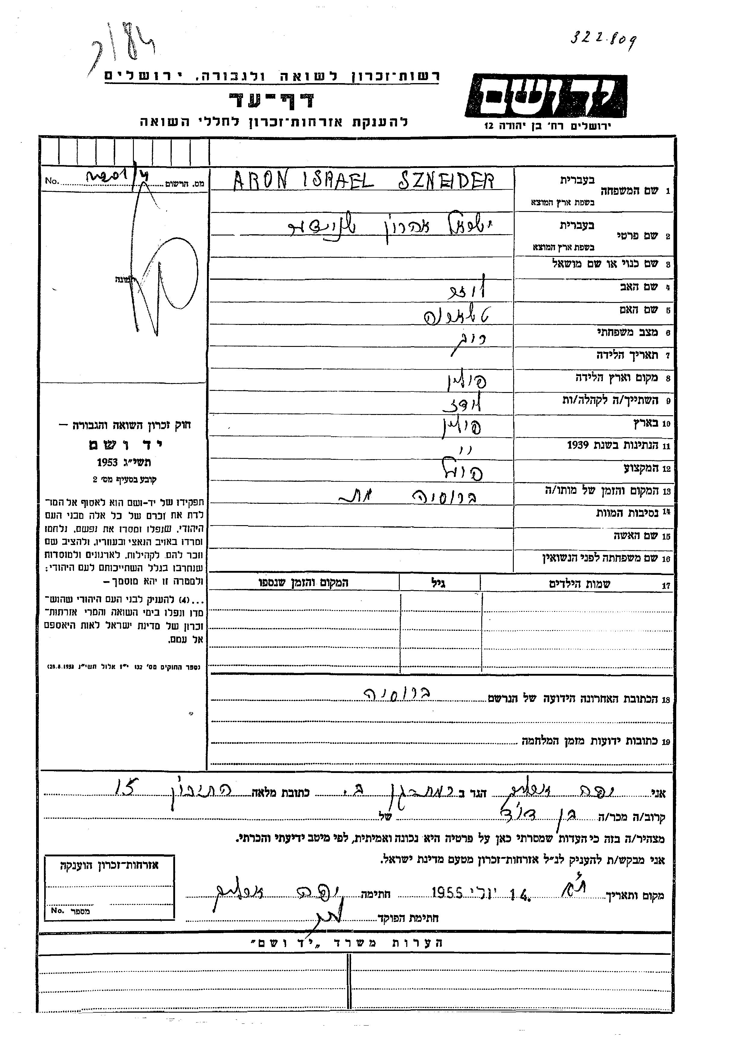 Aron Israel Szneider wurde in Polen geboren. Er war der Sohn von Eliezer und Charna. Er war Arbeiter/-in und Ledig. Vor dem Zweiten Weltkrieg lebte er in Lodz, Polen.