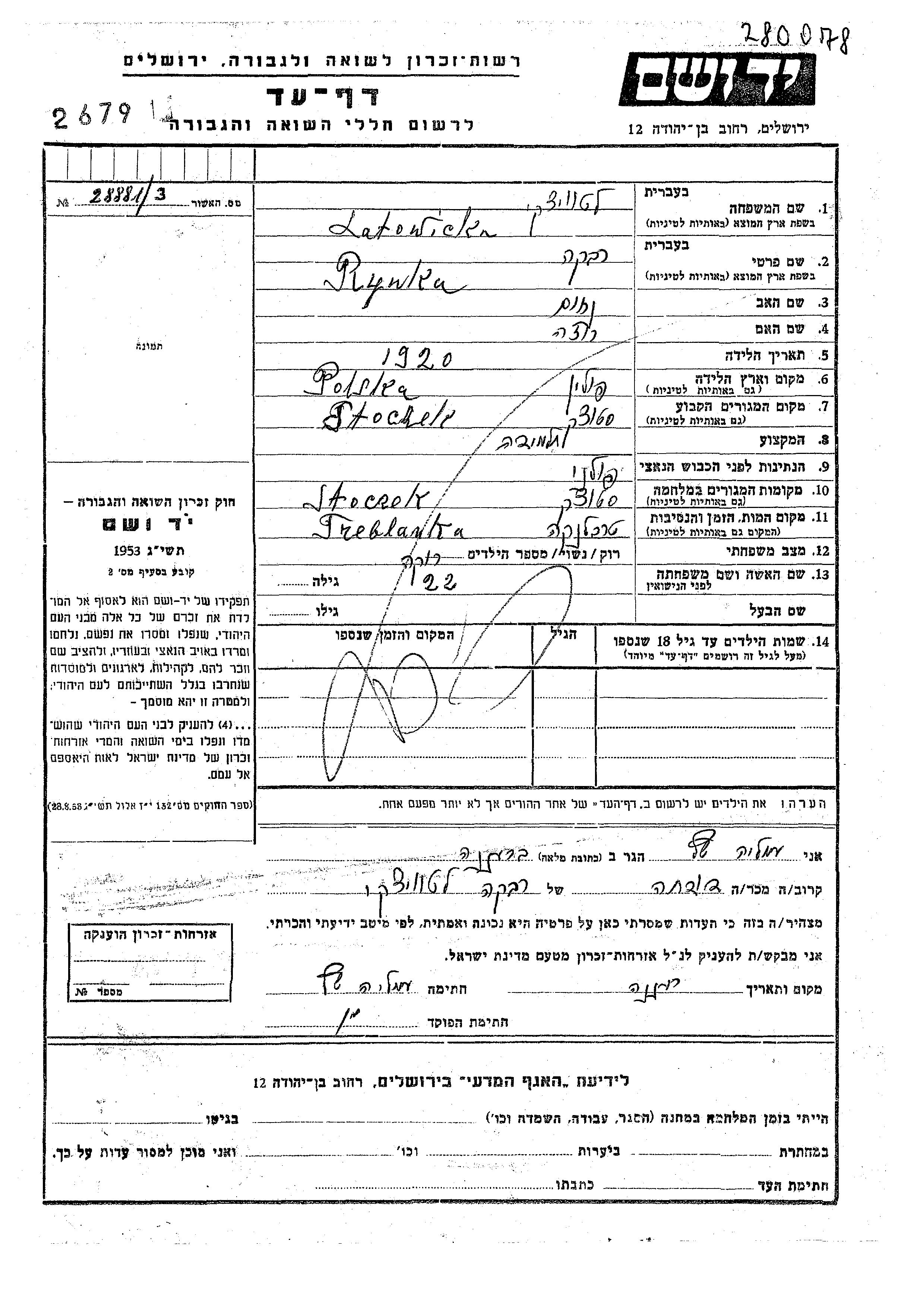 Rywka Latowicki wurde im Jahr 1920 in Polen geboren. Sie war die Tochter von Nakhum und Roza. Sie war Schüler/-in und Ledig. Vor dem Zweiten Weltkrieg lebte sie in Stoczek, Polen. Während des Krieges war sie in Stoczek, Polen.