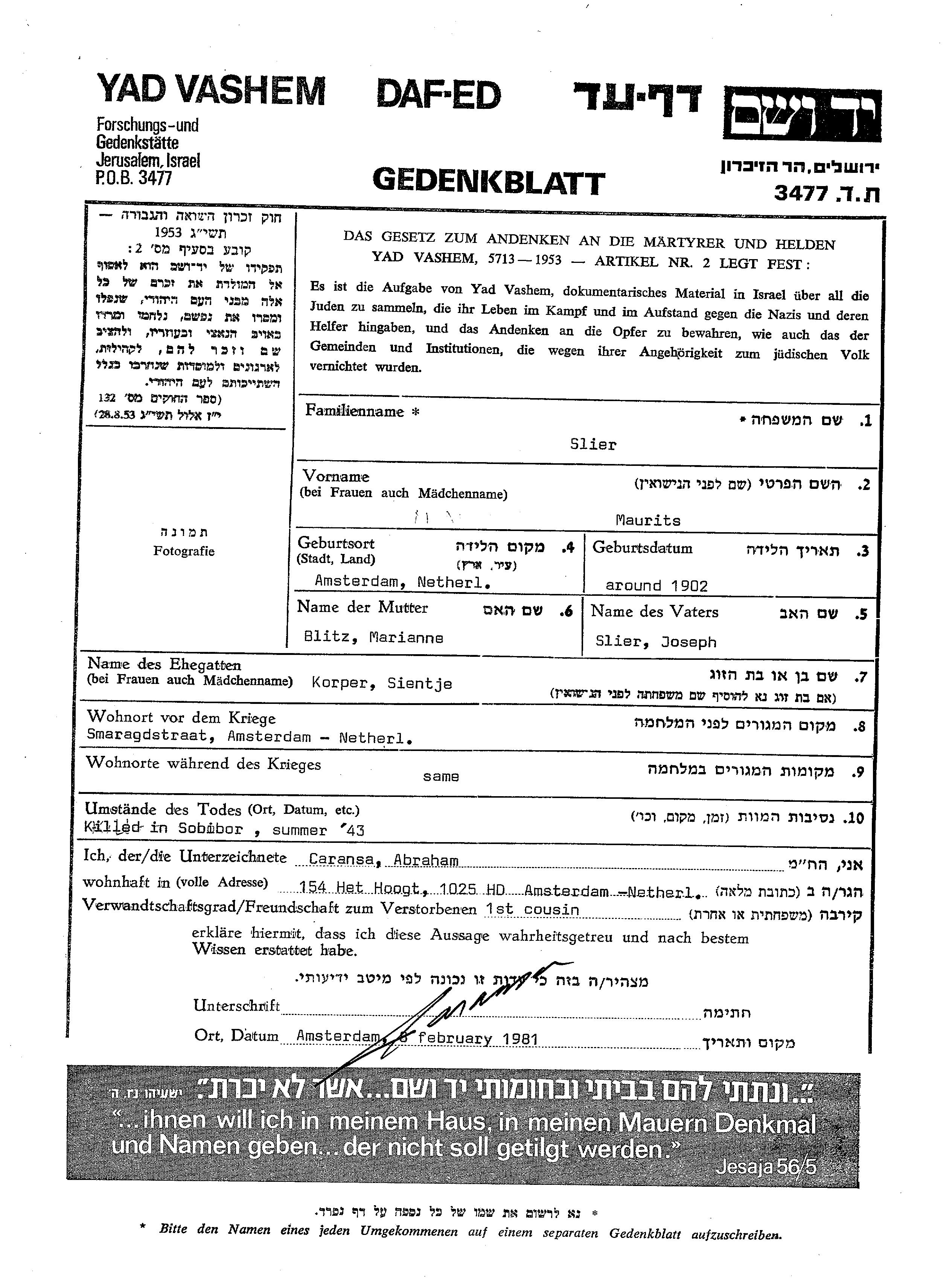 Maurits Slier wurde im Jahr 1902 in Amsterdam, Niederlande geboren. Er war der Sohn von Joseph und Marianne. Er war mit Sientje, geb. Korper Verheiratet. Vor dem Zweiten Weltkrieg lebte er in Amsterdam, Niederlande. Während des Krieges war er in Amsterdam, Niederlande.