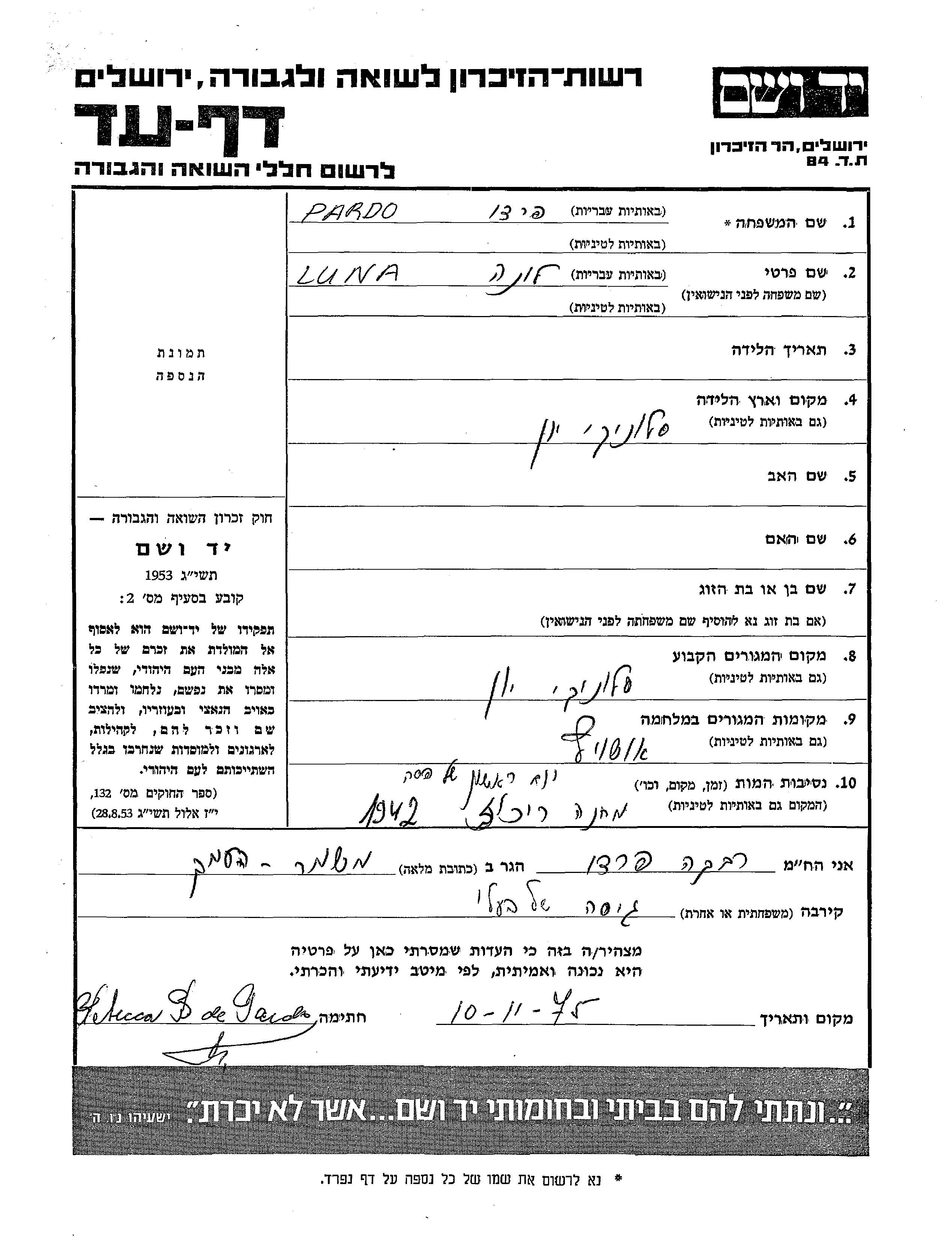Luna wurde in der Schoah ermordet. Todesort: unbekannt im Jahr 1942.