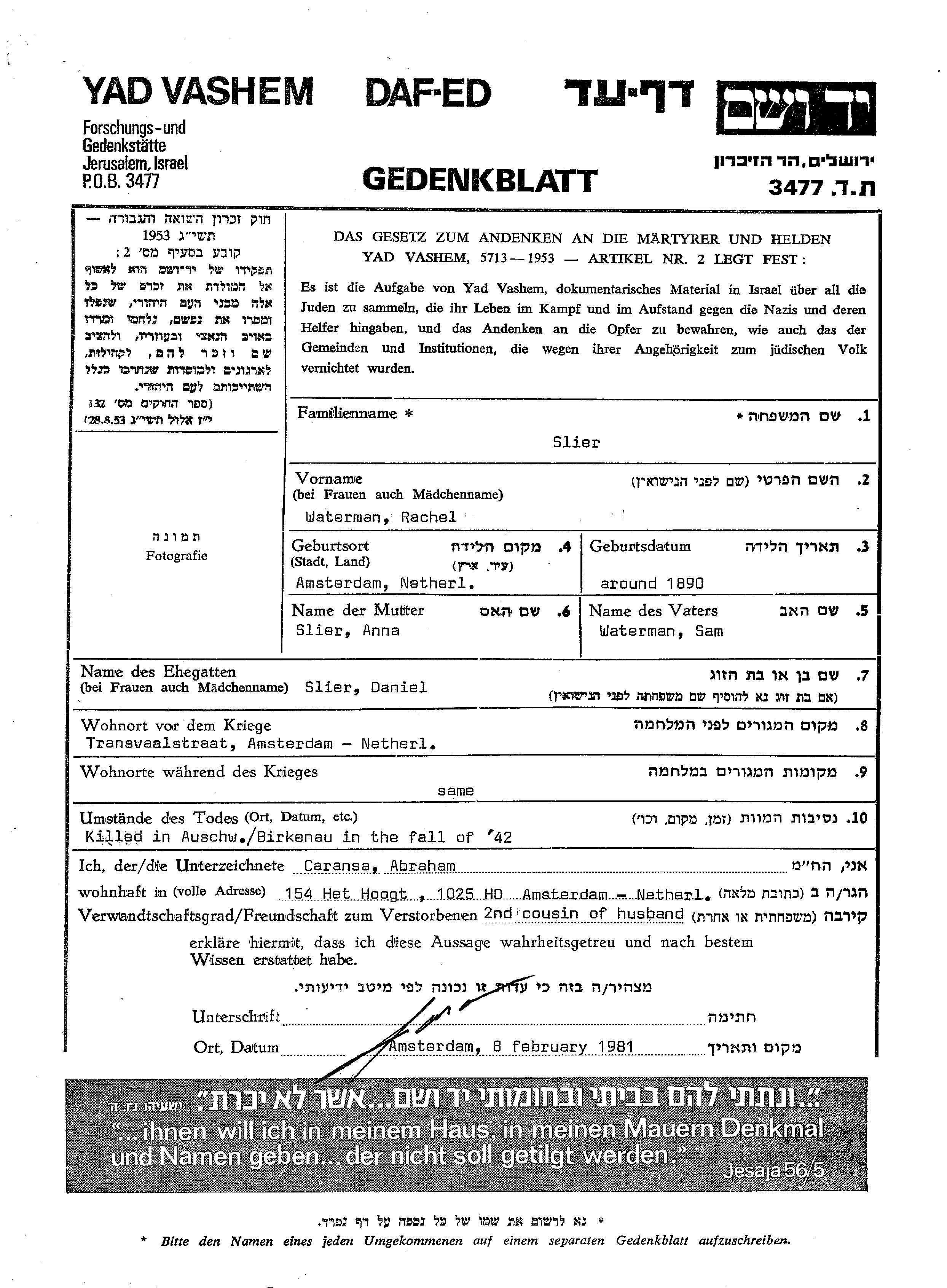 Rachel Slier, geb. Waterman wurde im Jahr 1890 in Amsterdam, Niederlande geboren. Sie war die Tochter von Sam und Anna. Sie war mit Daniel Verheiratet. Vor dem Zweiten Weltkrieg lebte sie in Amsterdam, Niederlande. Während des Krieges war sie in Amsterdam, Niederlande.