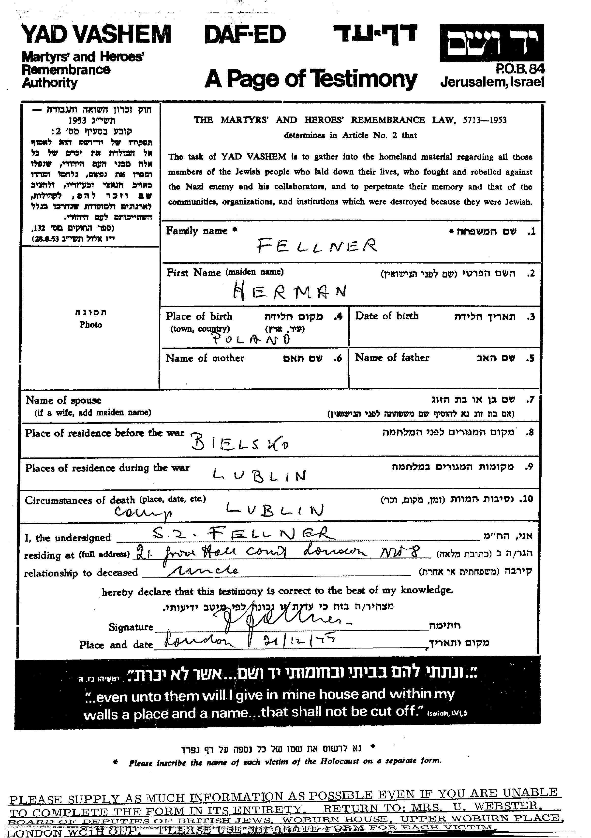 Herman Fellner wurde in Polen geboren. Vor dem Zweiten Weltkrieg lebte er in Bielsko, Polen. Während des Krieges war er in Lublin, Polen.