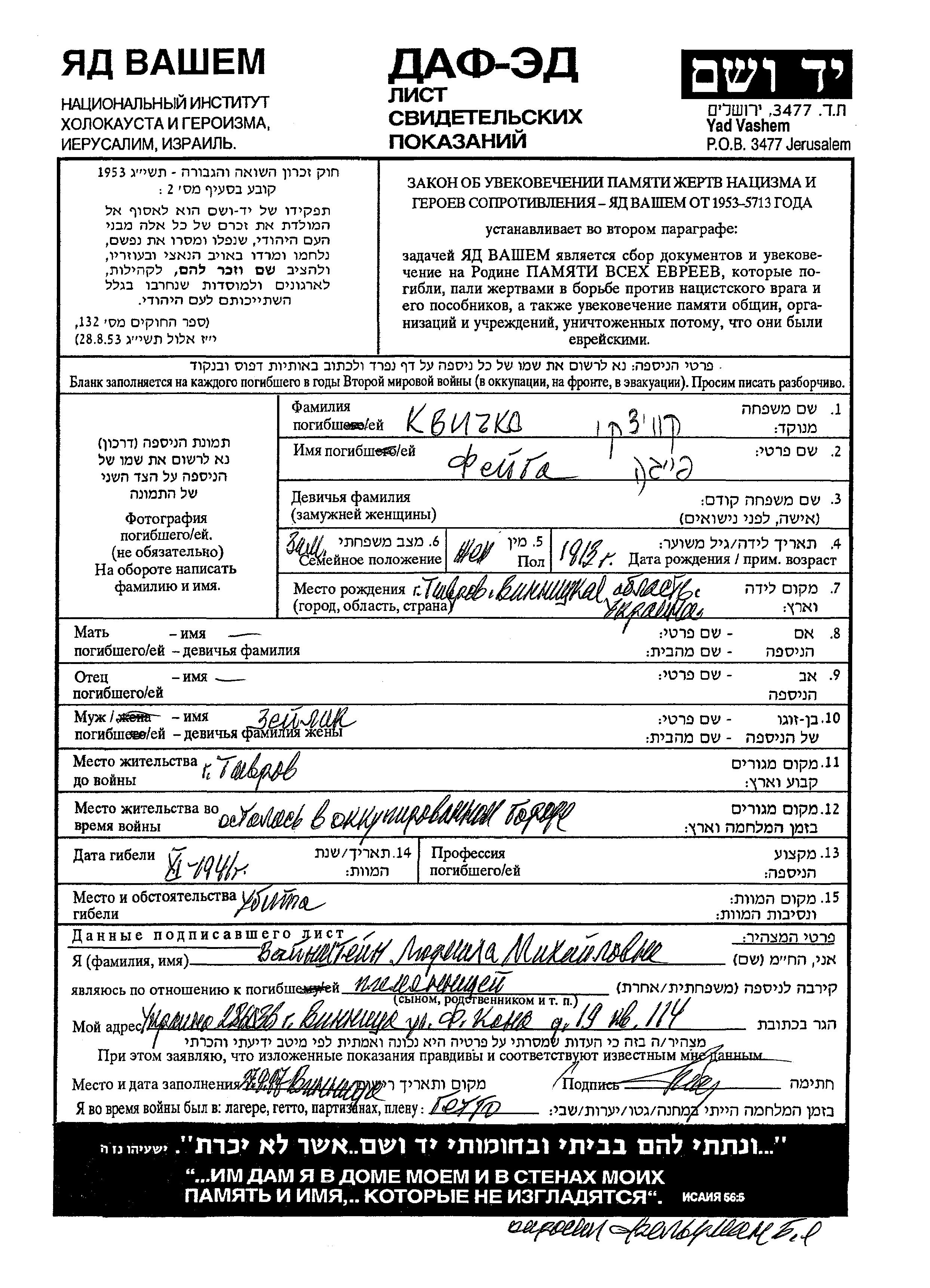 Feiga Kvichko wurde im Jahr 1913 in Tivrov*, Ukraine (UdSSR) geboren. Sie war mit Zeilik Verheiratet. Vor dem Zweiten Weltkrieg lebte sie in Tivrov*, Ukraine (UdSSR). Während des Krieges war sie in Tivrov*, Ukraine (UdSSR).
