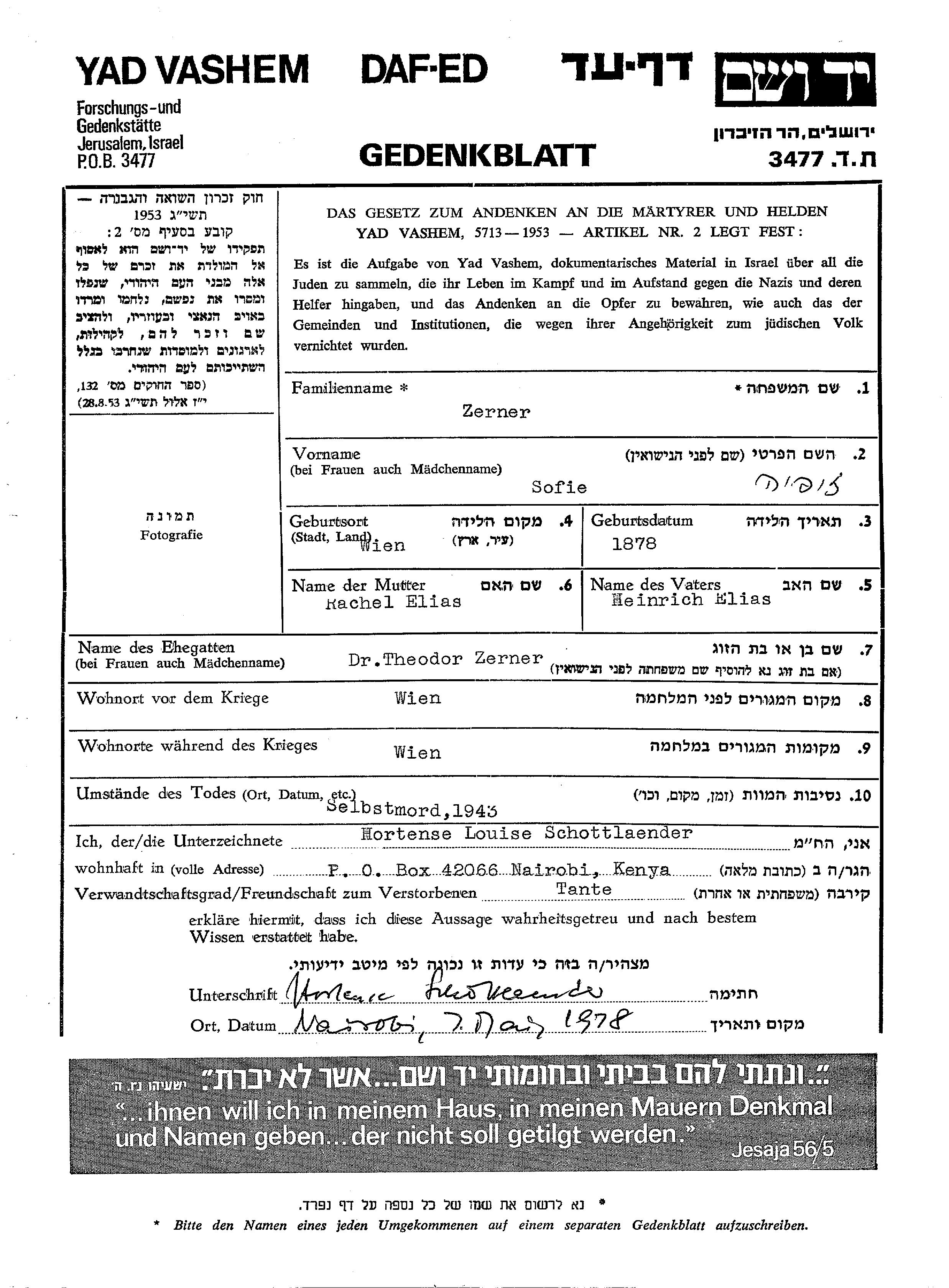 Sofie Zerner, geb. Elias wurde im Jahr 1878 in Wien, Österreich geboren. Sie war die Tochter von Heinrich und Rachel. Sie war mit Theodor Verheiratet. Vor dem Zweiten Weltkrieg lebte sie in Wien, Österreich. Während des Krieges war sie in Wien, Österreich.