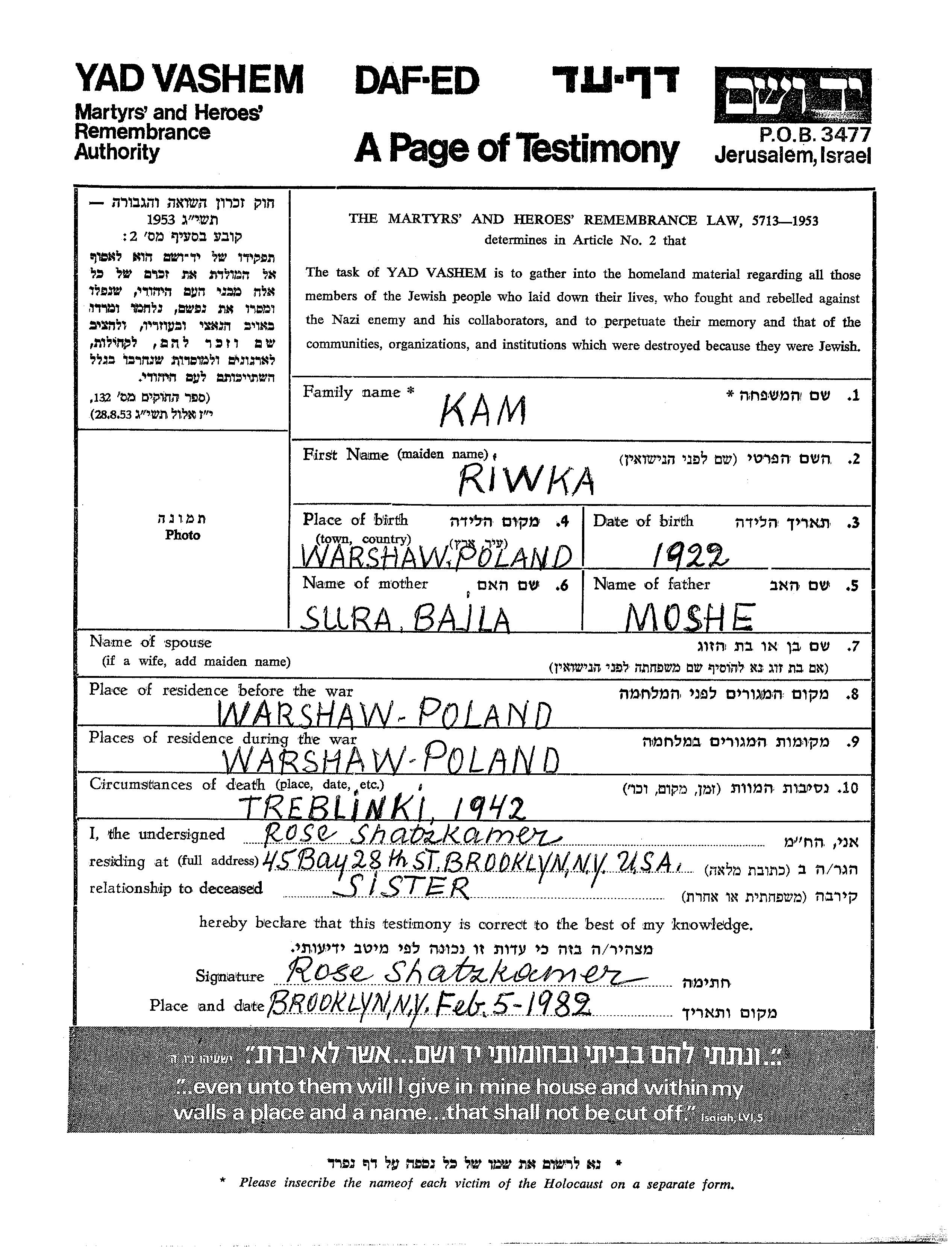 Riwka Kam wurde im Jahr 1922 in Warsaw, Polen geboren. Sie war die Tochter von Moshe und Sura Bajla. Vor dem Zweiten Weltkrieg lebte sie in Warsaw, Polen. Während des Krieges war sie in Warsaw, Polen.