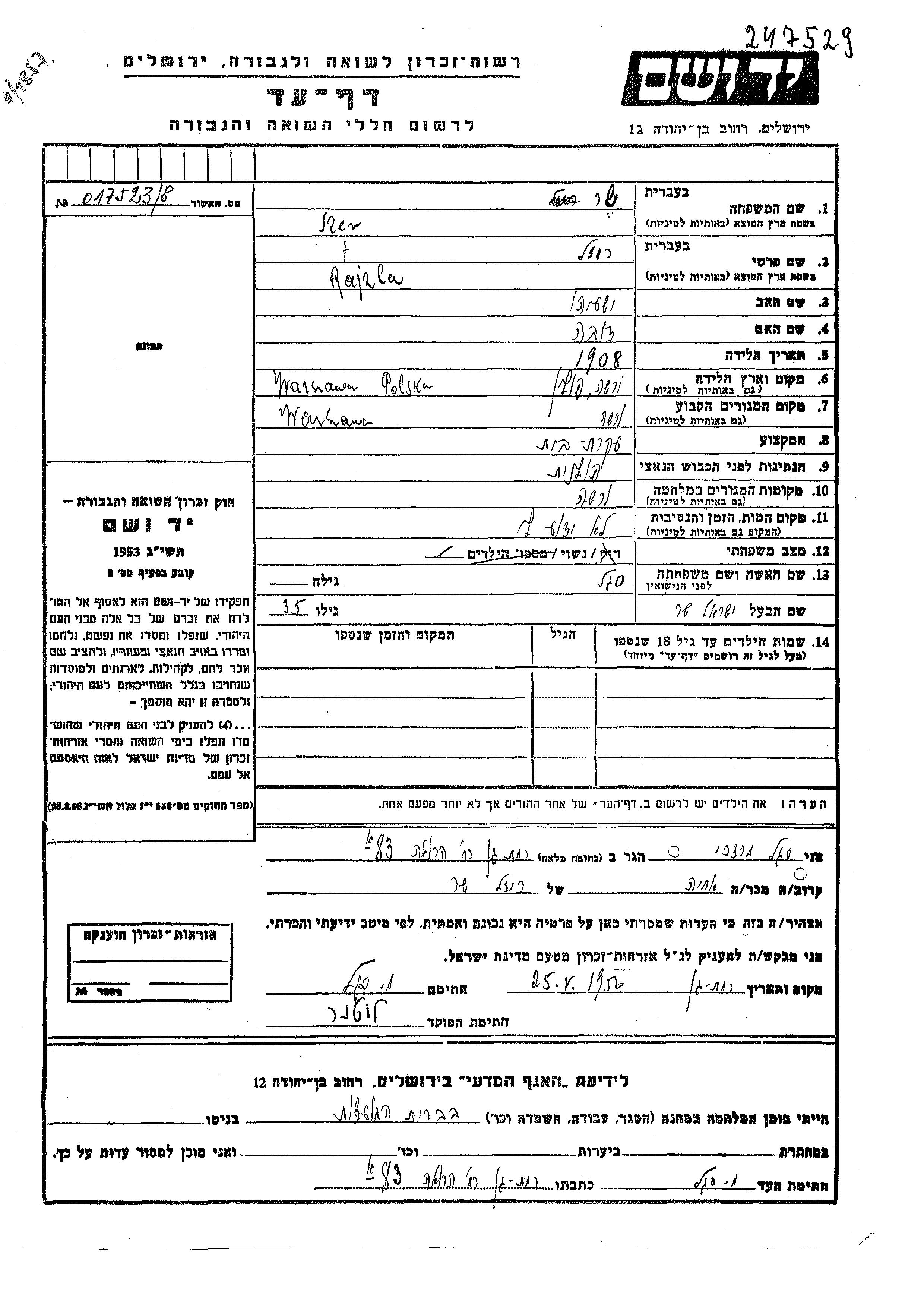 Rajzla Szer, geb. Segal wurde im Jahr 1908 in Warszawa, Polen geboren. Sie war die Tochter von Yeshayahu und Doba. Sie war Hausfrau und mit Yisrael Verheiratet. Vor dem Zweiten Weltkrieg lebte sie in Warszawa, Polen. Während des Krieges war sie in Warszawa, Polen.