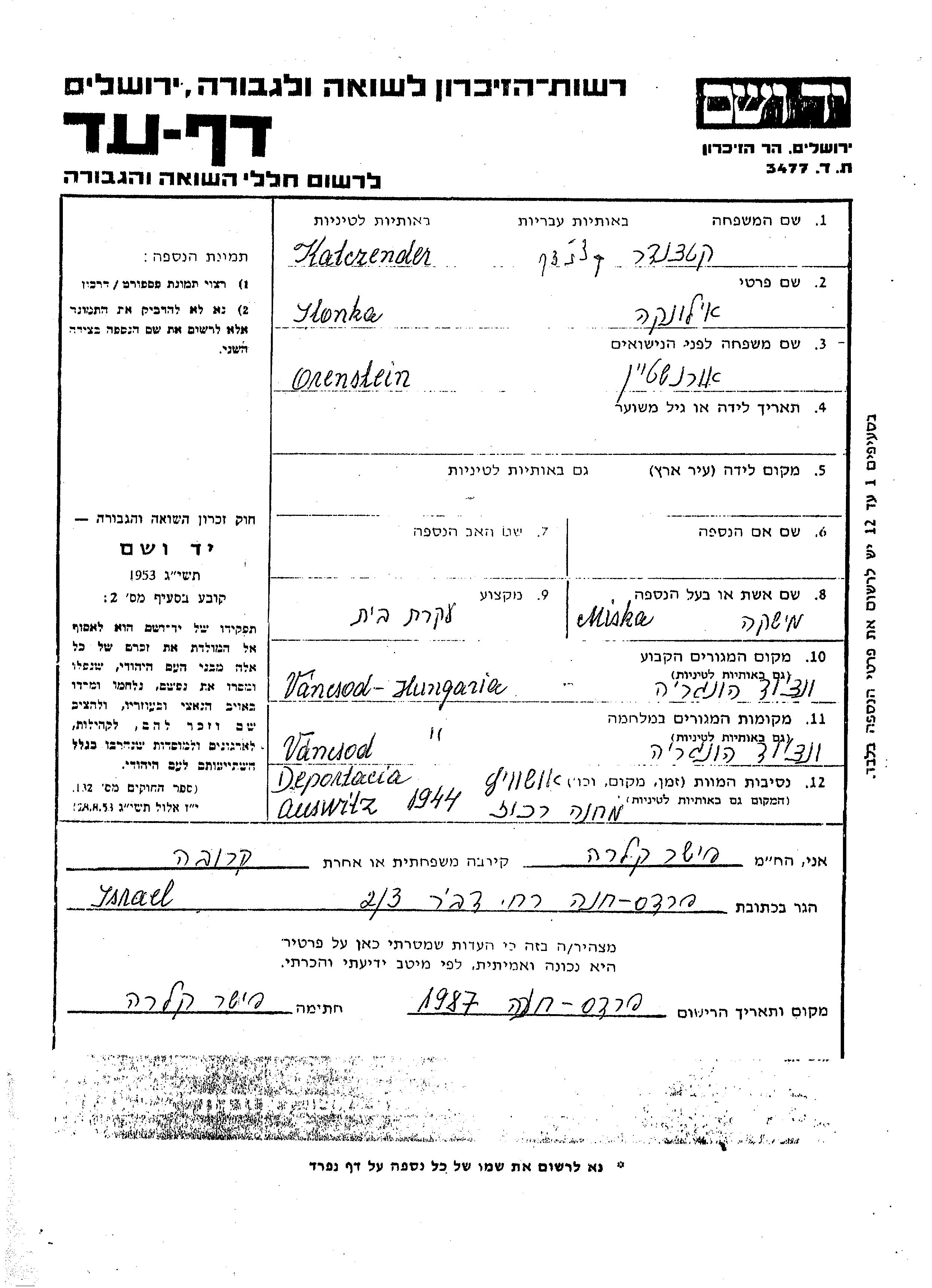 Ilonka Katczender, geb. Orenstein. Sie war Hausfrau und mit Miska Mishka Verheiratet. Vor dem Zweiten Weltkrieg lebte sie in Vancsod, Ungarn. Während des Krieges war sie in Vancsod, Ungarn.