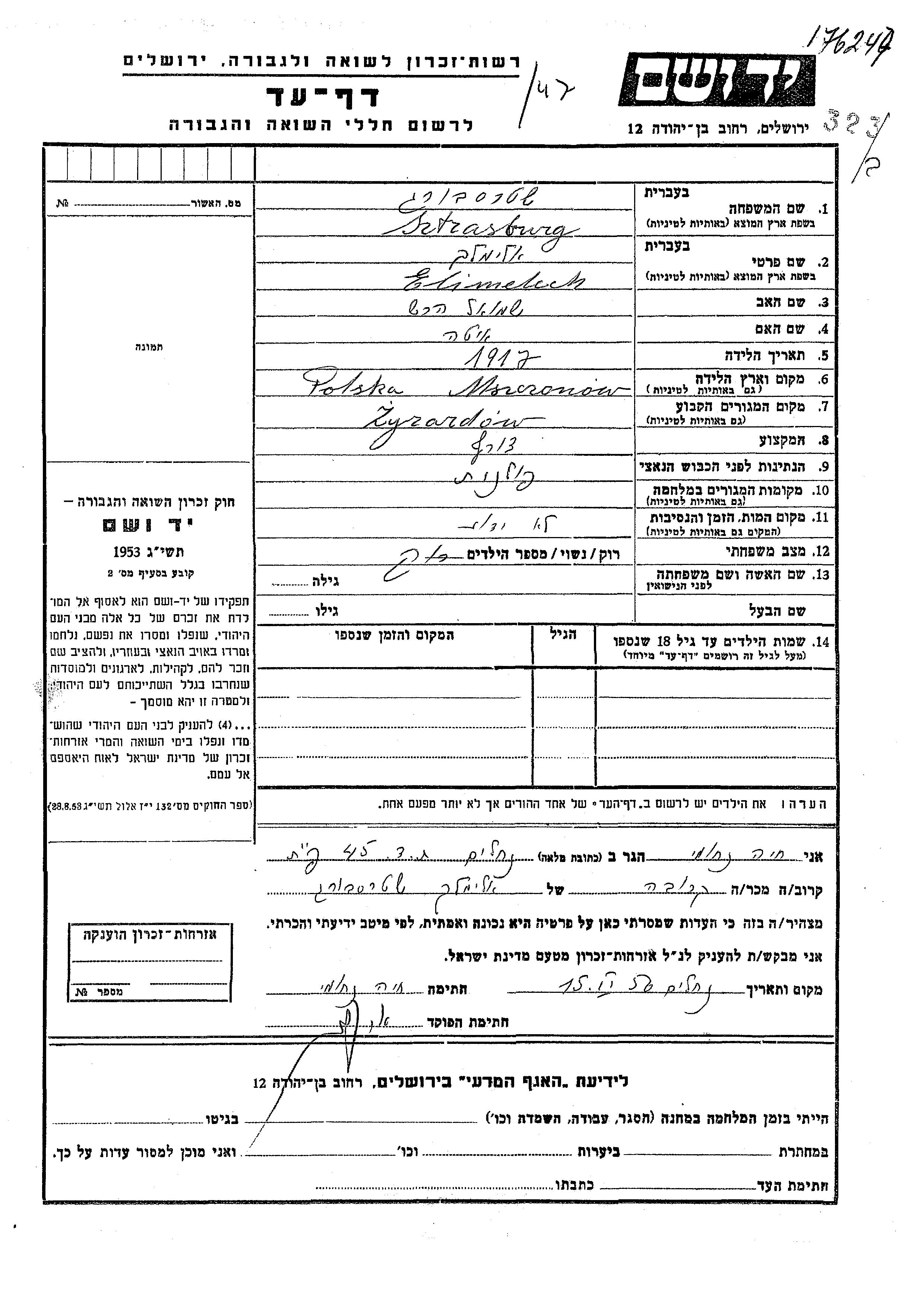 Elimelech Sztrasburg wurde im Jahr 1917 in Mszczonow, Polen geboren. Er war der Sohn von Shmuel Hersh und Ita. Er war Goldschmied/-in und Ledig. Vor dem Zweiten Weltkrieg lebte er in Zyrardow, Polen.