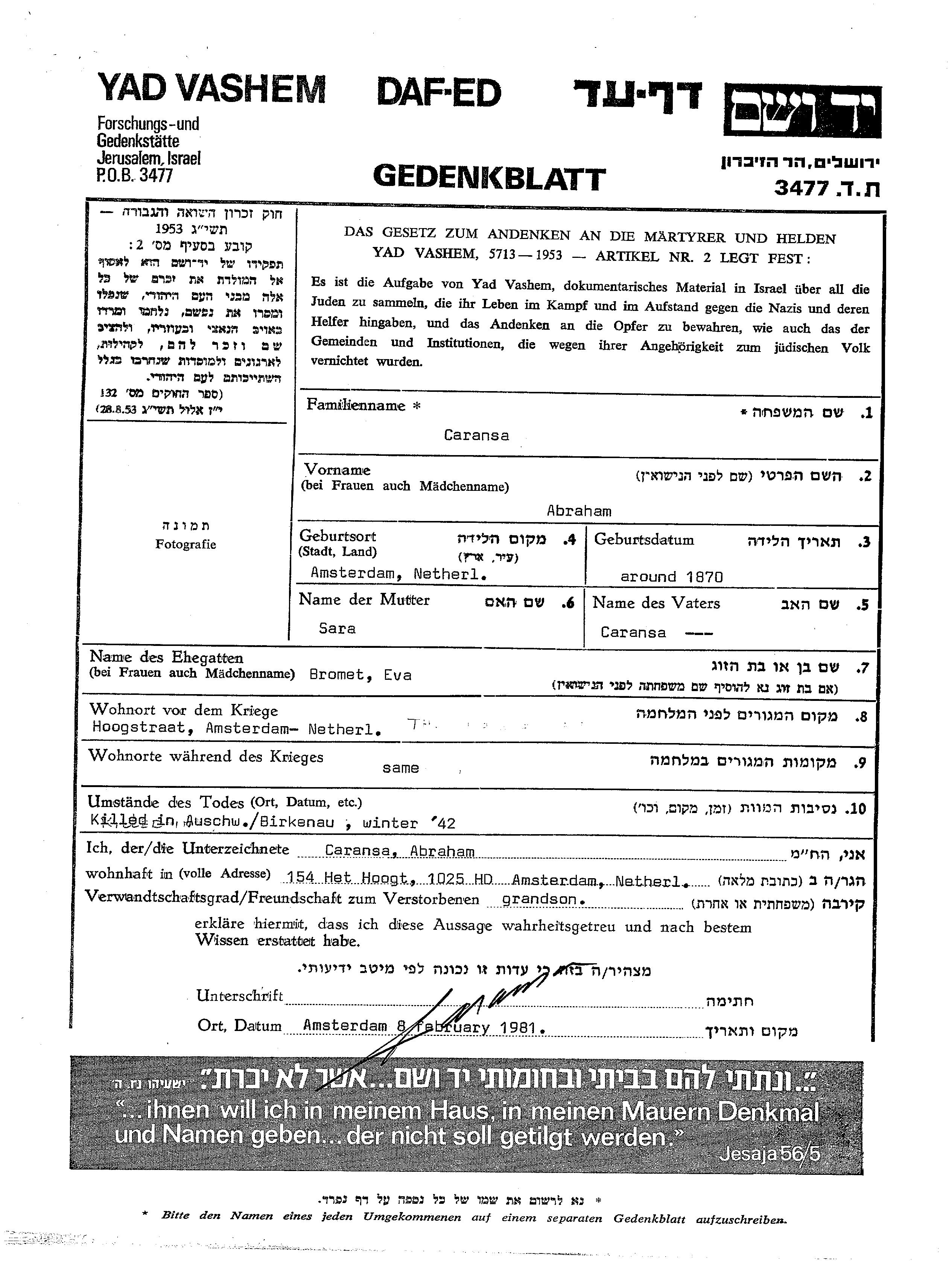 Abraham Caransa wurde im Jahr 1870 in Amsterdam, Niederlande geboren. Er war der Sohn von Sara. Er war mit Eva, geb. Bromet Verheiratet. Vor dem Zweiten Weltkrieg lebte er in Amsterdam, Niederlande. Während des Krieges war er in Amsterdam, Niederlande.