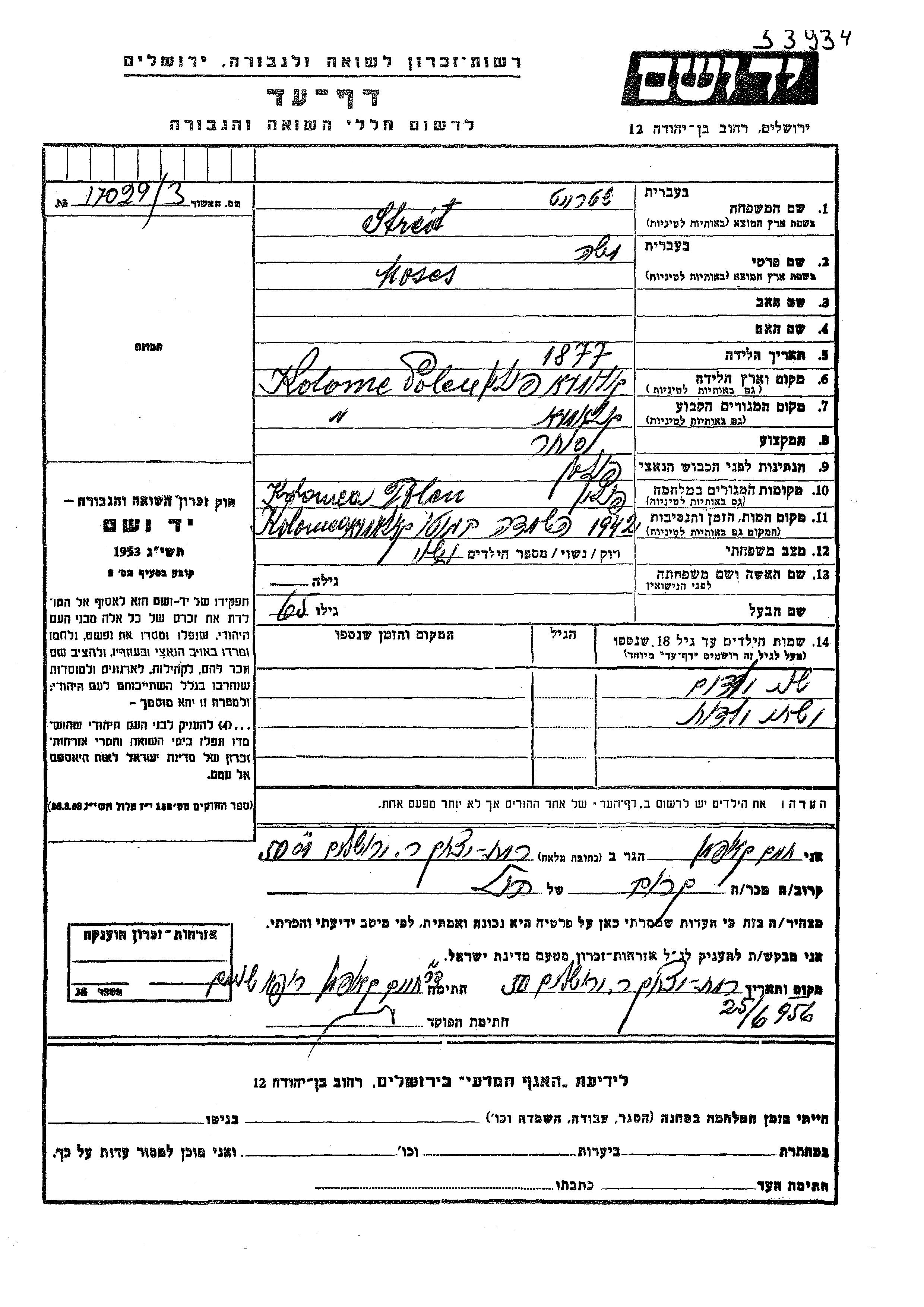 Moses Streit wurde im Jahr 1877 in Kolomyja, Polen geboren. Er war Kaufmann/-frau und Verheiratet. Vor dem Zweiten Weltkrieg lebte er in Kolomea, Polen. Während des Krieges war er in Kolomyja, Polen.