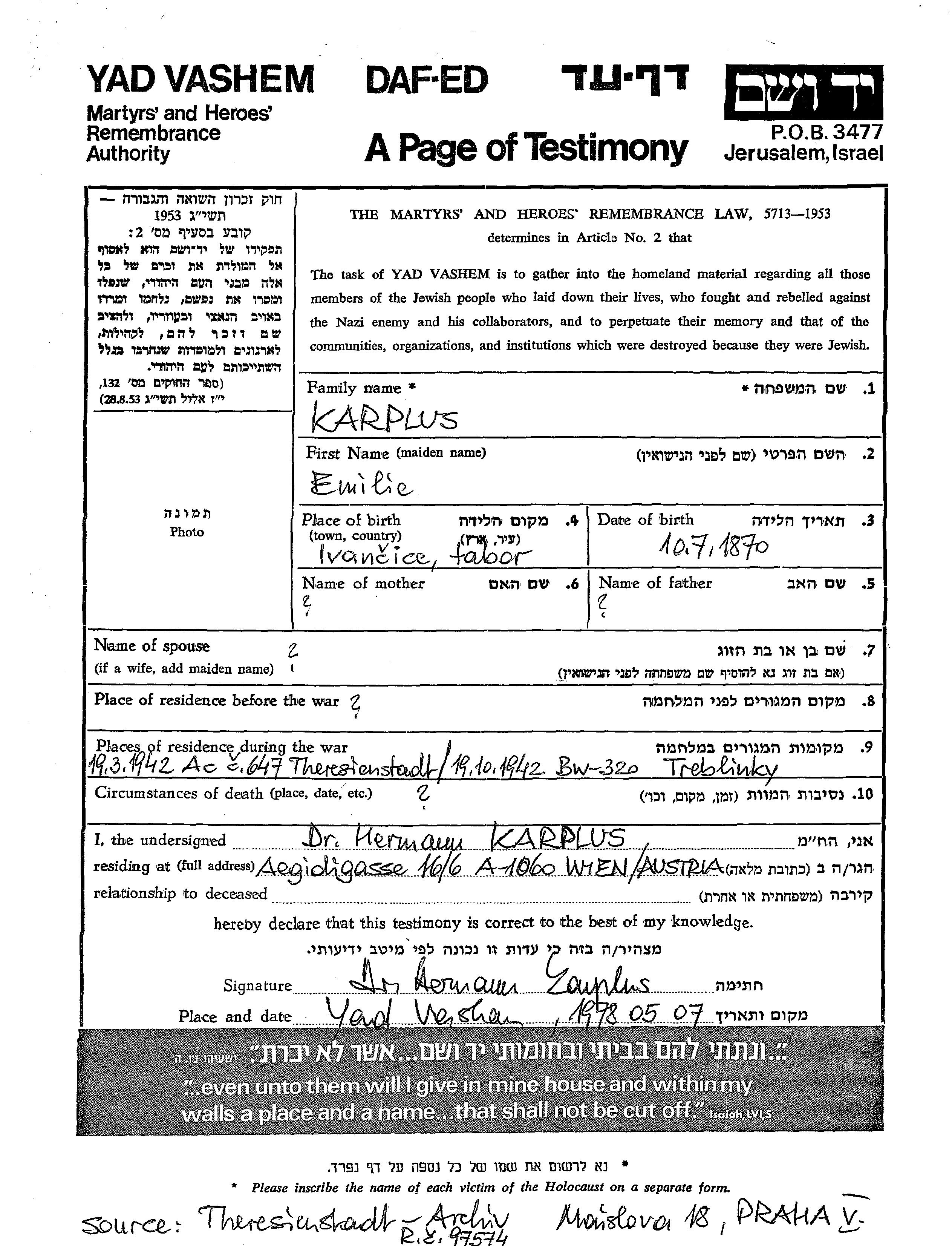 Emilie Karplus wurde im Jahr 1870 in Ivancice, Tschechoslowakei geboren. Während des Krieges war sie in Theresienstadt, Tschechoslowakei.