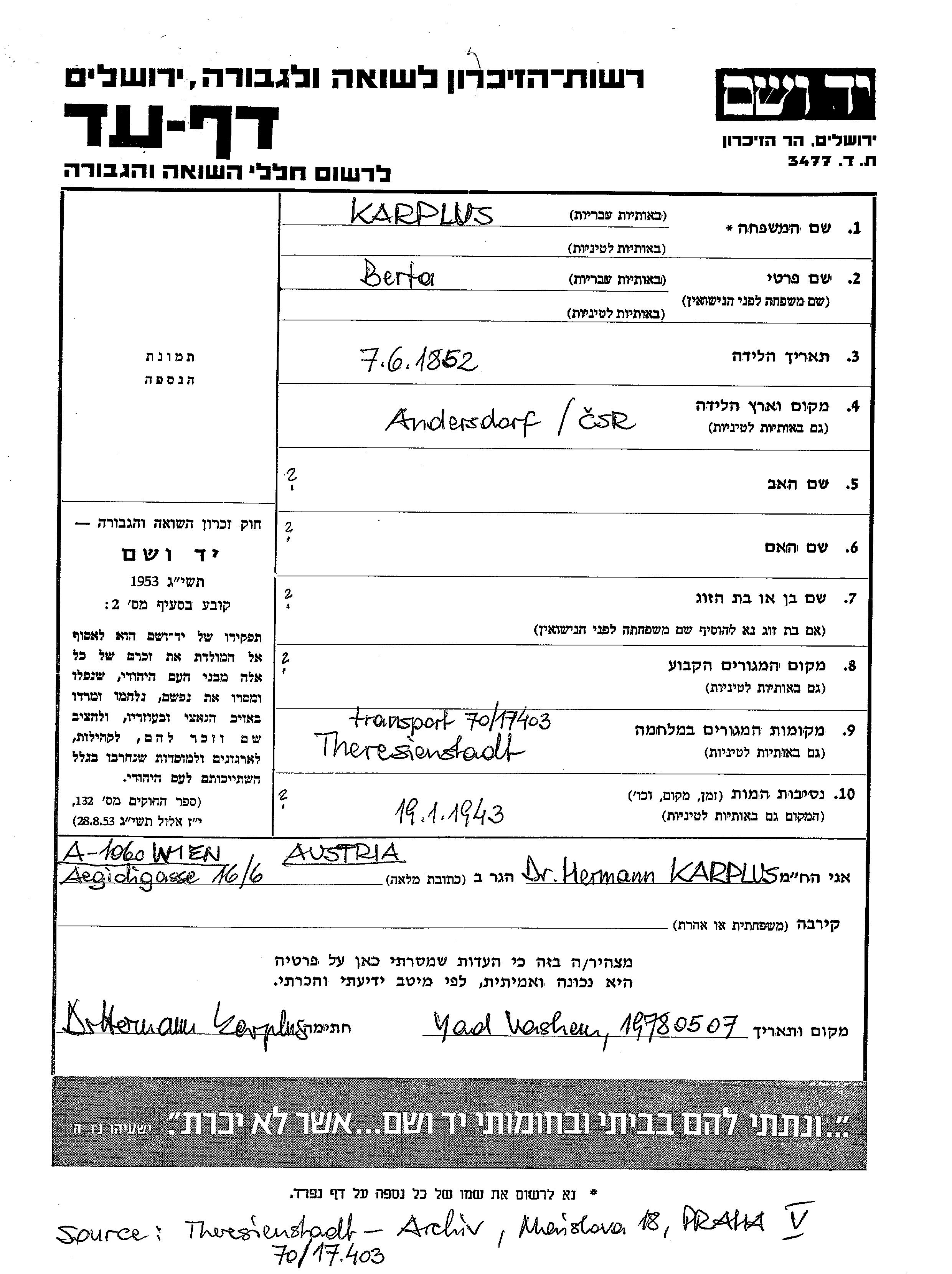 Berta Karplus wurde im Jahr 1852 in Andersdorf, Tschechoslowakei geboren. Während des Krieges war sie in Theresienstadt, Tschechoslowakei.