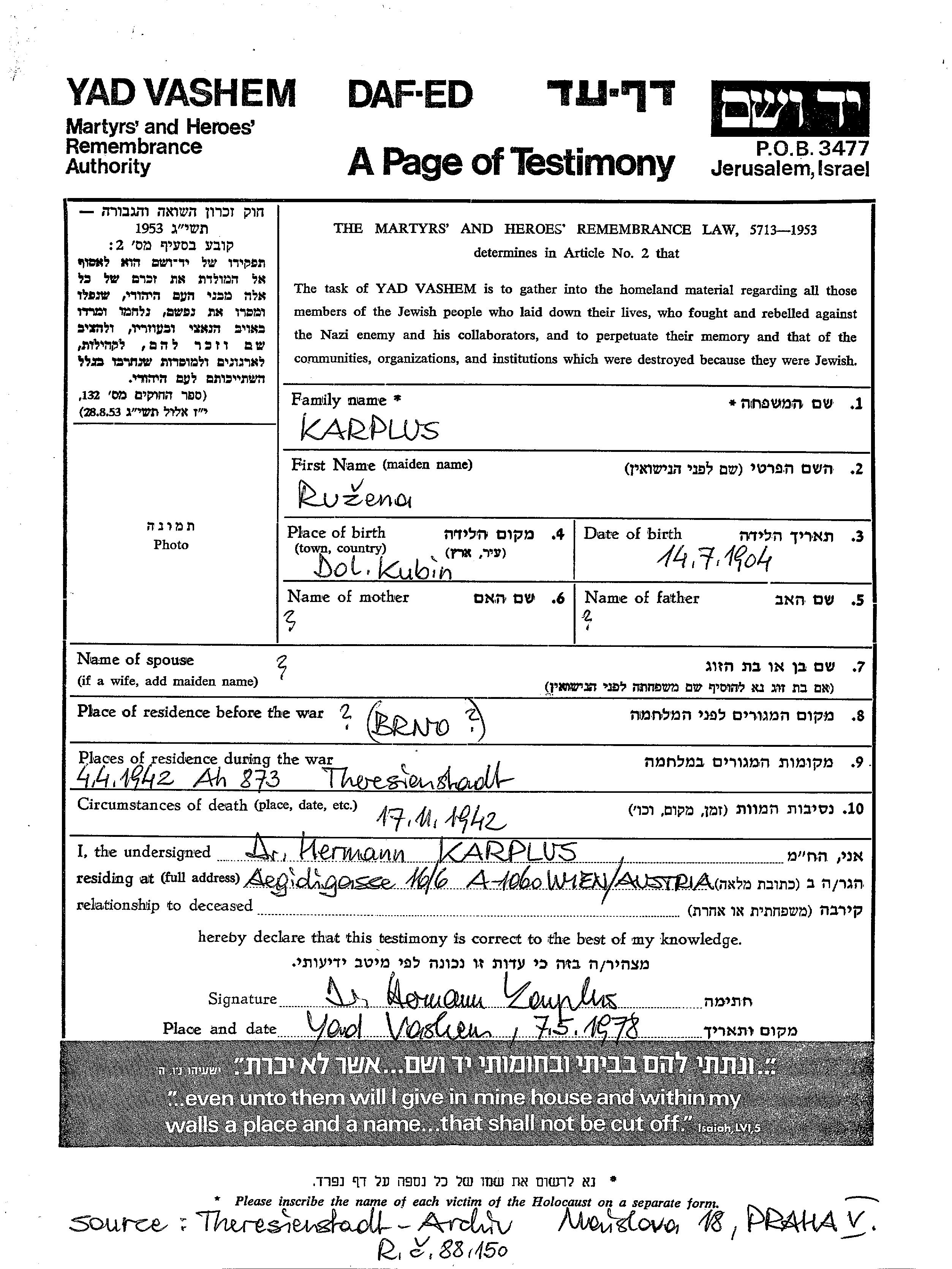 Ruzena Karplus wurde im Jahr 1904 in Kubin Dolny, Tschechoslowakei geboren. Vor dem Zweiten Weltkrieg lebte sie in Brno, Tschechoslowakei. Während des Krieges war sie in Theresienstadt, Tschechoslowakei.