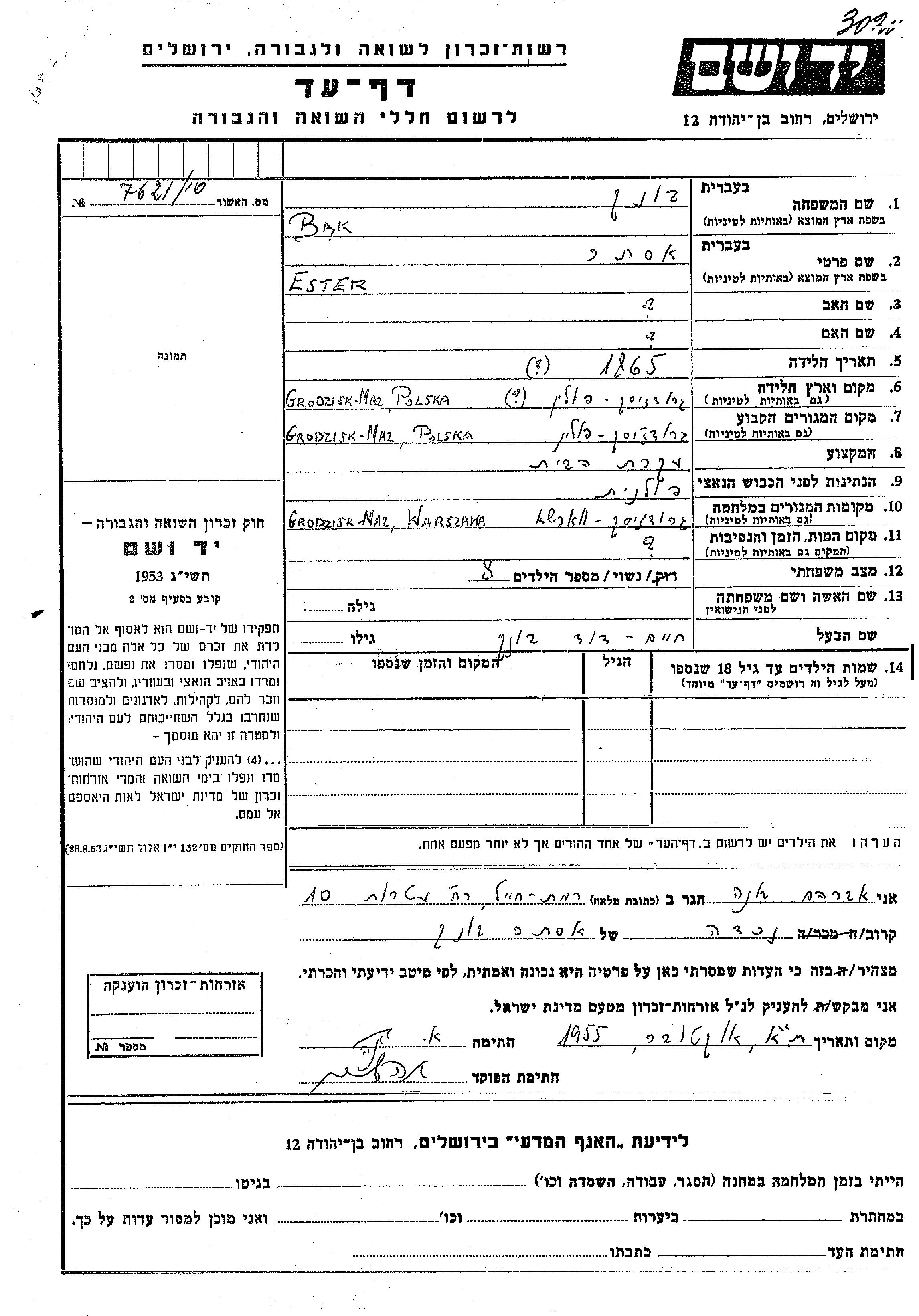 Ester Bonk wurde im Jahr 1865 in Grodzisk, Polen geboren. Sie war Hausfrau und mit Khaim David Verheiratet. Vor dem Zweiten Weltkrieg lebte sie in Grodzisk Mazowiecki, Polen. Während des Krieges war sie in Grodzisk Mazowiecki, Polen.