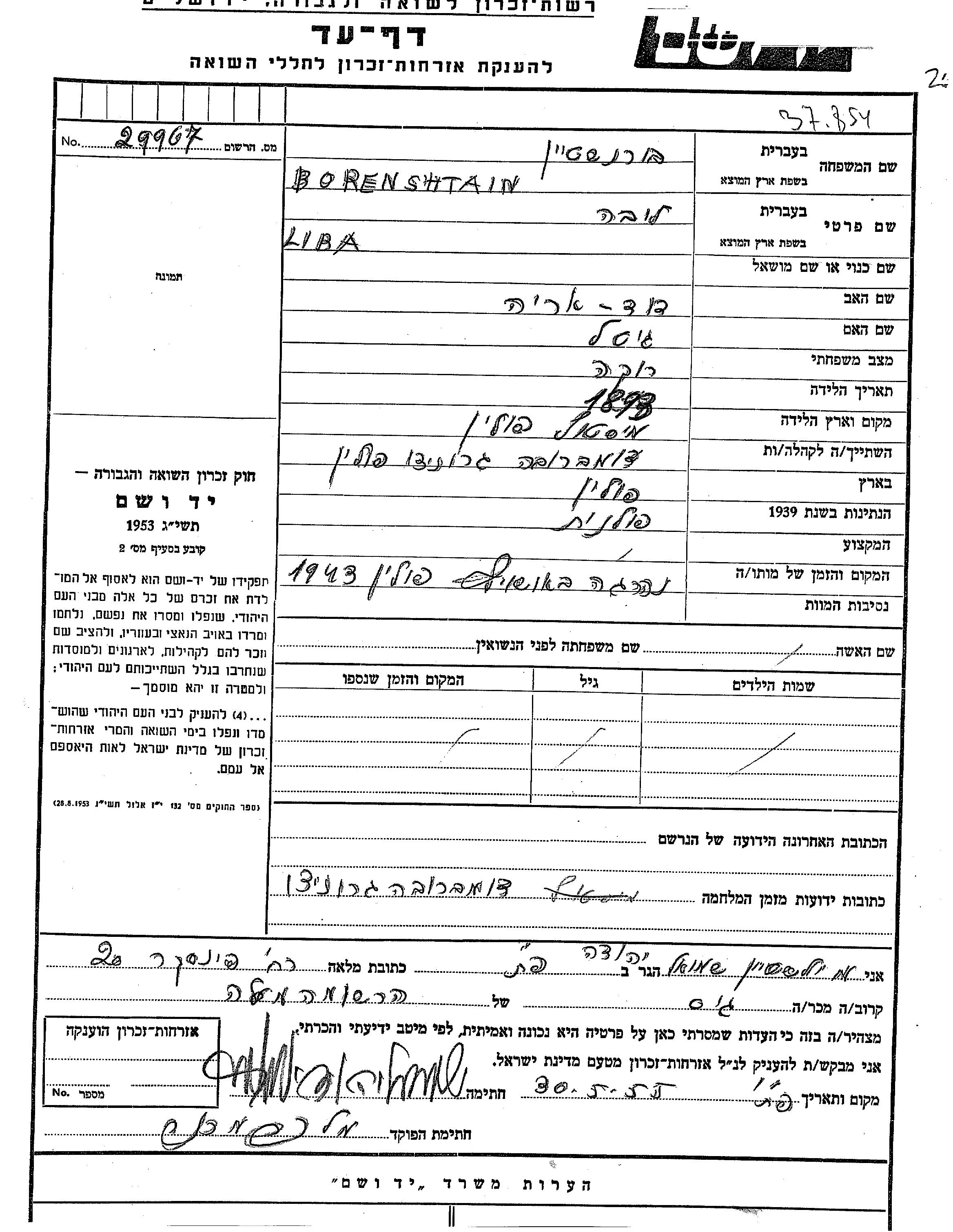 Liba Borenshtain wurde im Jahr 1893 in Mistow, Polen geboren. Sie war die Tochter von David Arie und Gitel. Sie war Ledig. Während des Krieges war sie in Gronitza, Polen.