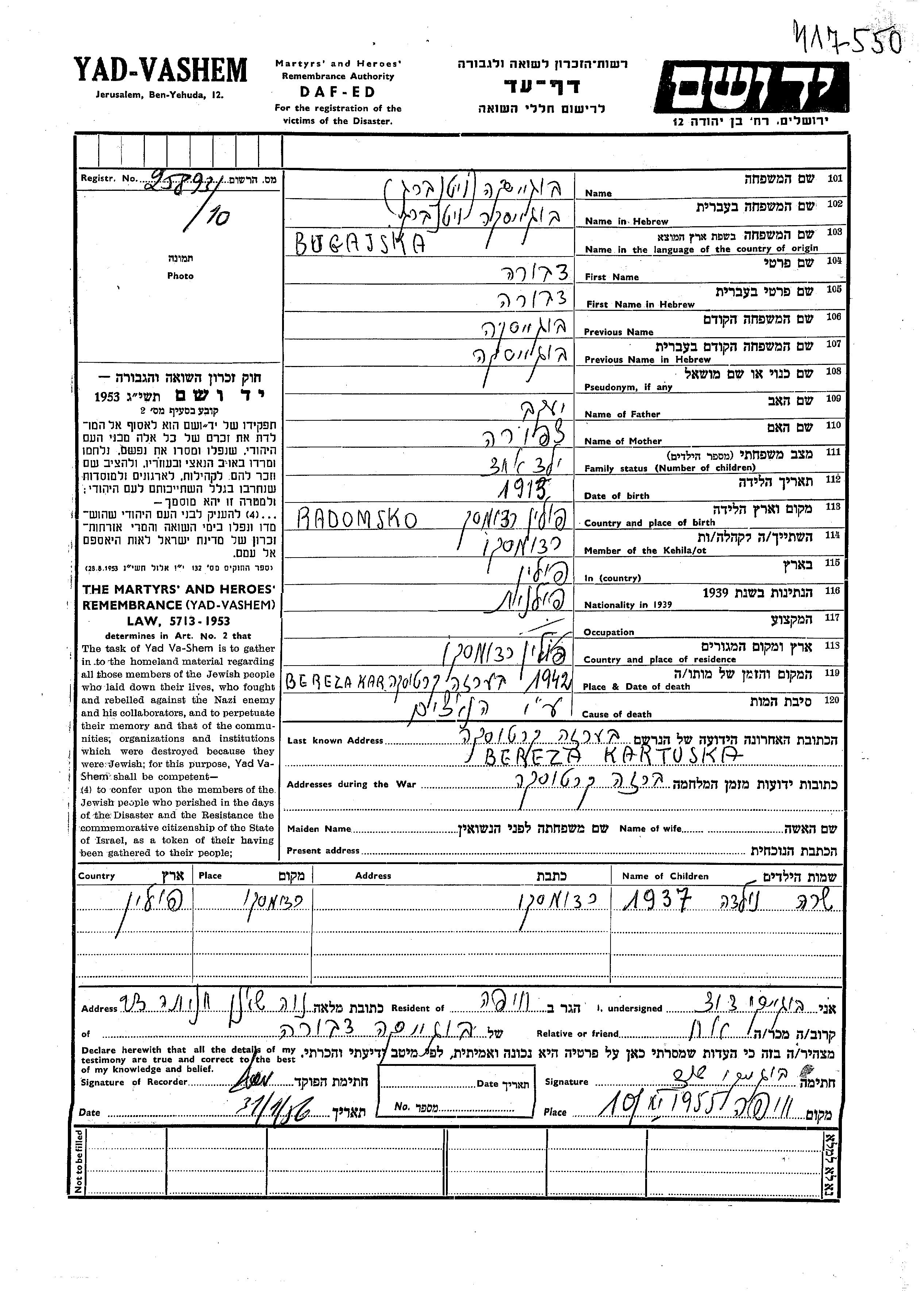 Dvora wurde in der Schoah ermordet. Todesort: Bereza Kartuska, Polen im Jahr 1942.