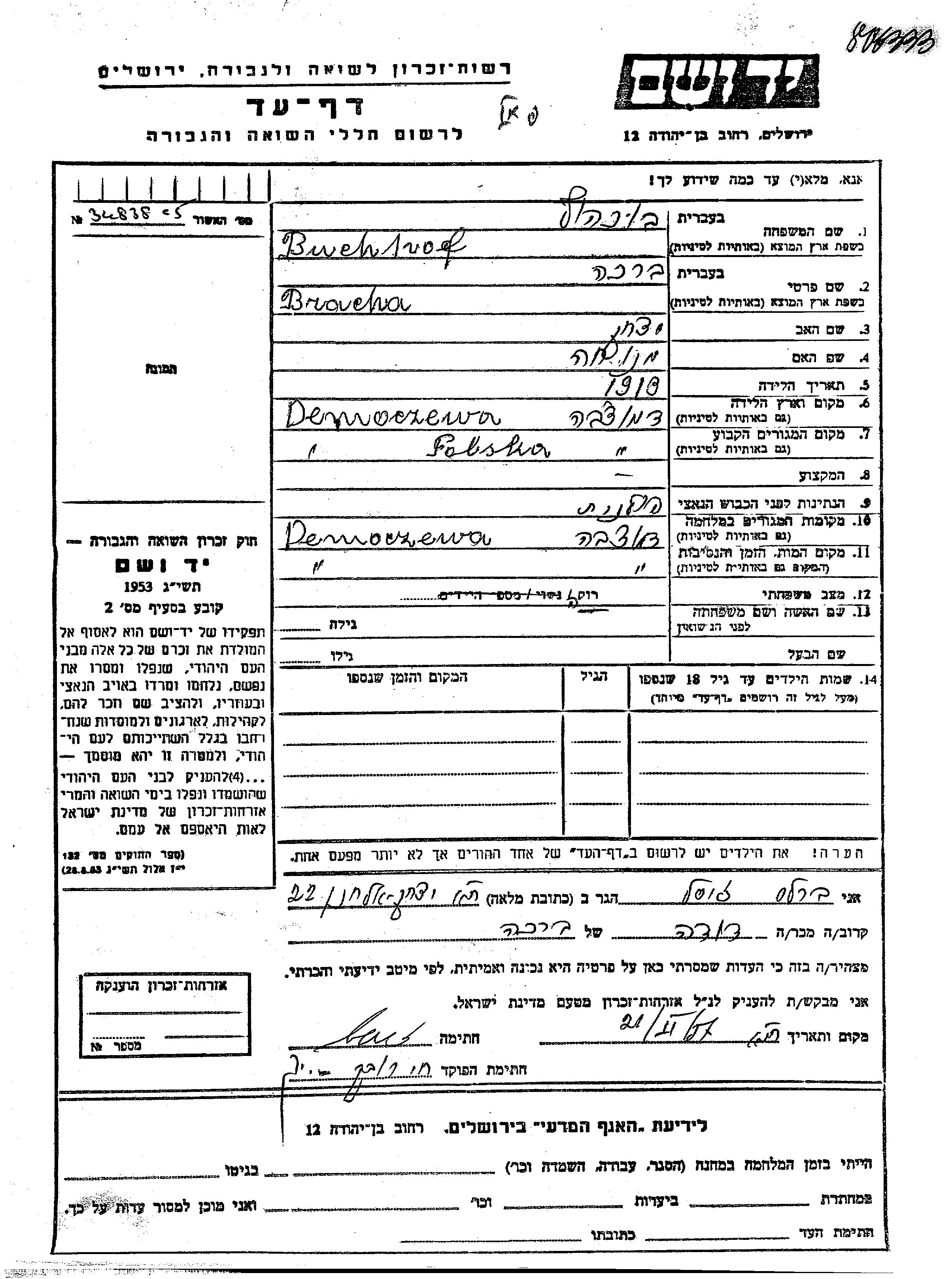 Bracha Buchhof wurde im Jahr 1913 in Democzewa, Polen geboren. Sie war die Tochter von Yitzkhak und Menukha. Sie war Ledig. Vor dem Zweiten Weltkrieg lebte sie in Democzewa, Polen. Während des Krieges war sie in Democzewa, Polen.
