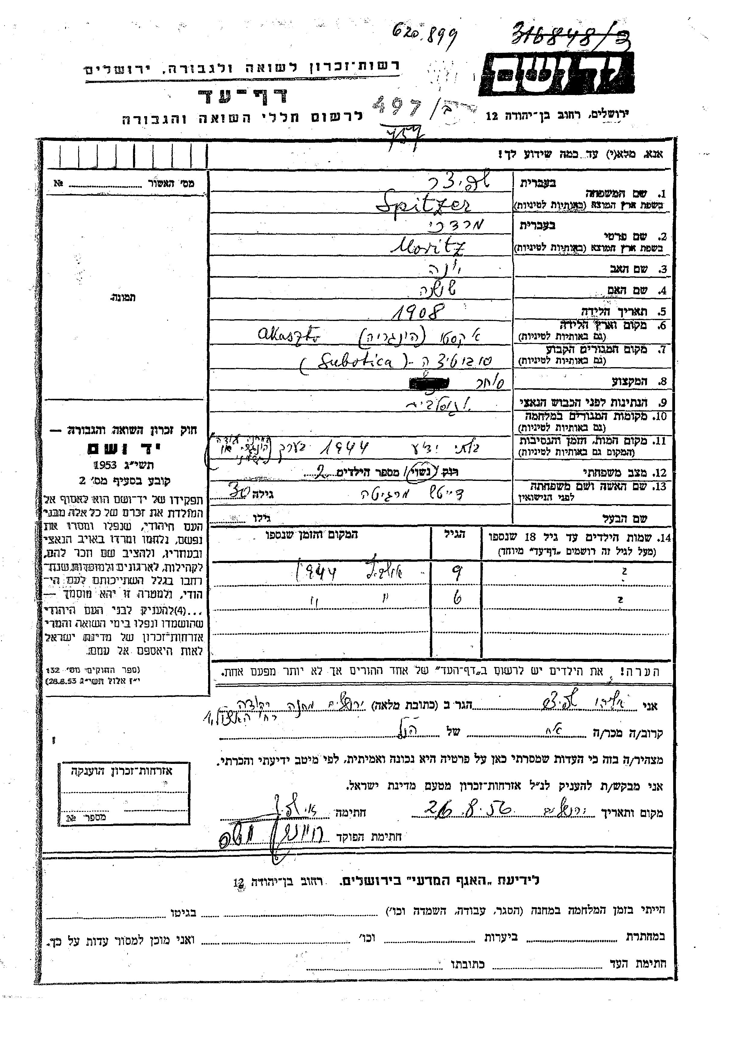 Moritz Mordekhai Spitzer wurde im Jahr 1908 in Akaszto, Ungarn geboren. Er war der Sohn von Yona und Shoshana. Er war Kaufmann/-frau und mit Margareta, geb. Deich Verheiratet. Vor dem Zweiten Weltkrieg lebte er in Subotica, Jugoslawien.