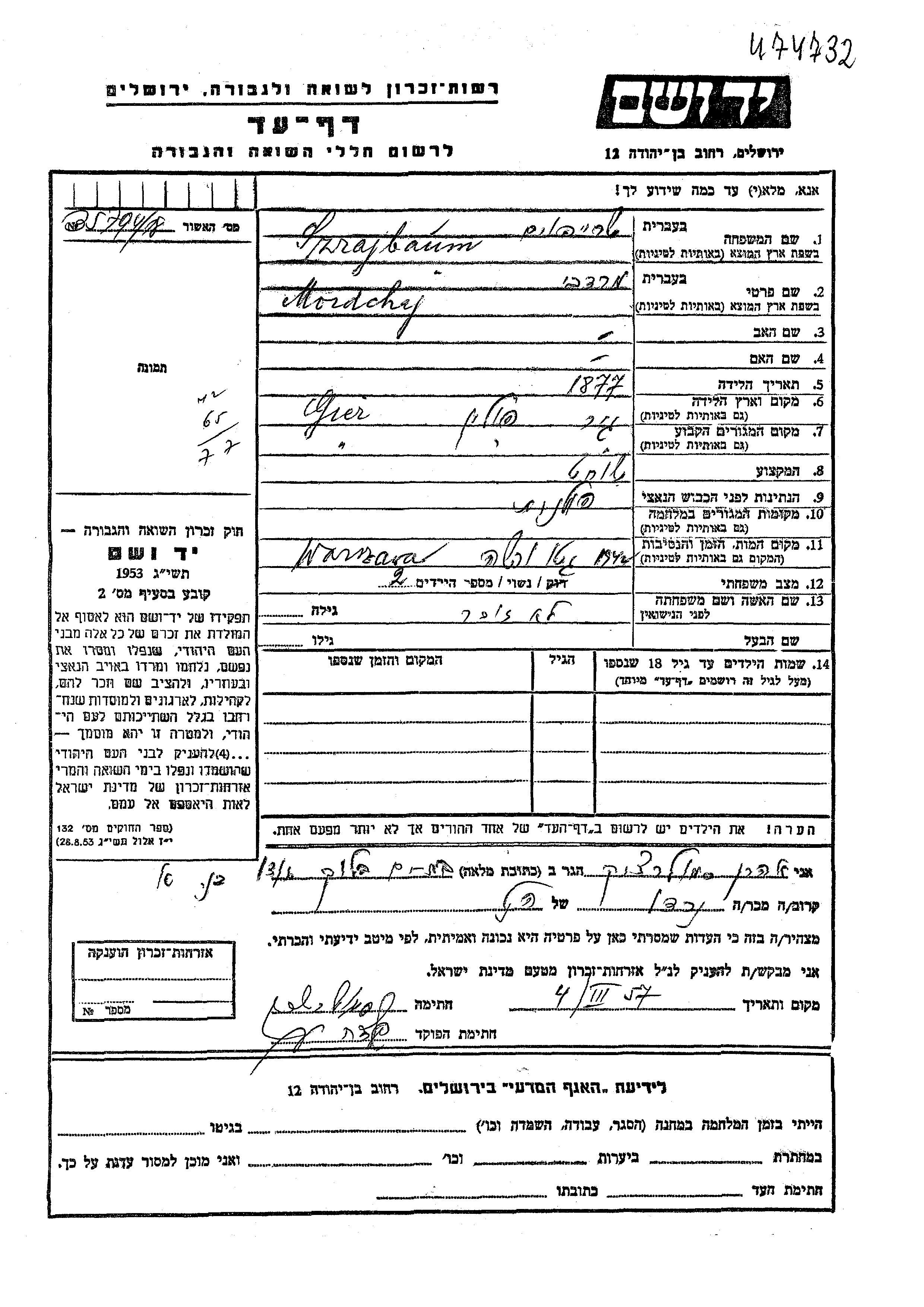 Mordchaj wurde in der Schoah ermordet. Todesort: Warsaw, Polen im Jahr 1942.