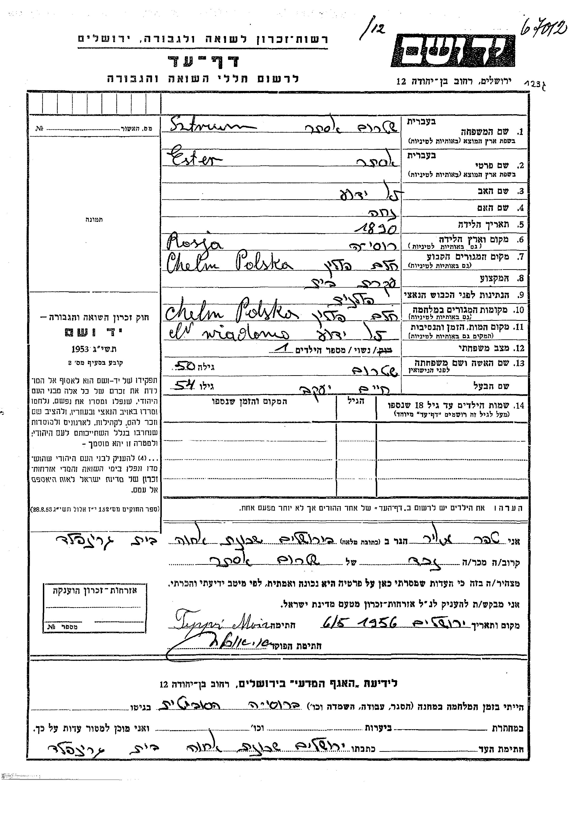 Ester Sztrum wurde im Jahr 1890 in Russland (UdSSR) geboren. Sie war die Tochter von Nekha. Sie war Hausfrau und mit Khaim Yaakov Verheiratet. Vor dem Zweiten Weltkrieg lebte sie in Chelm, Polen. Während des Krieges war sie in Chelm, Polen.
