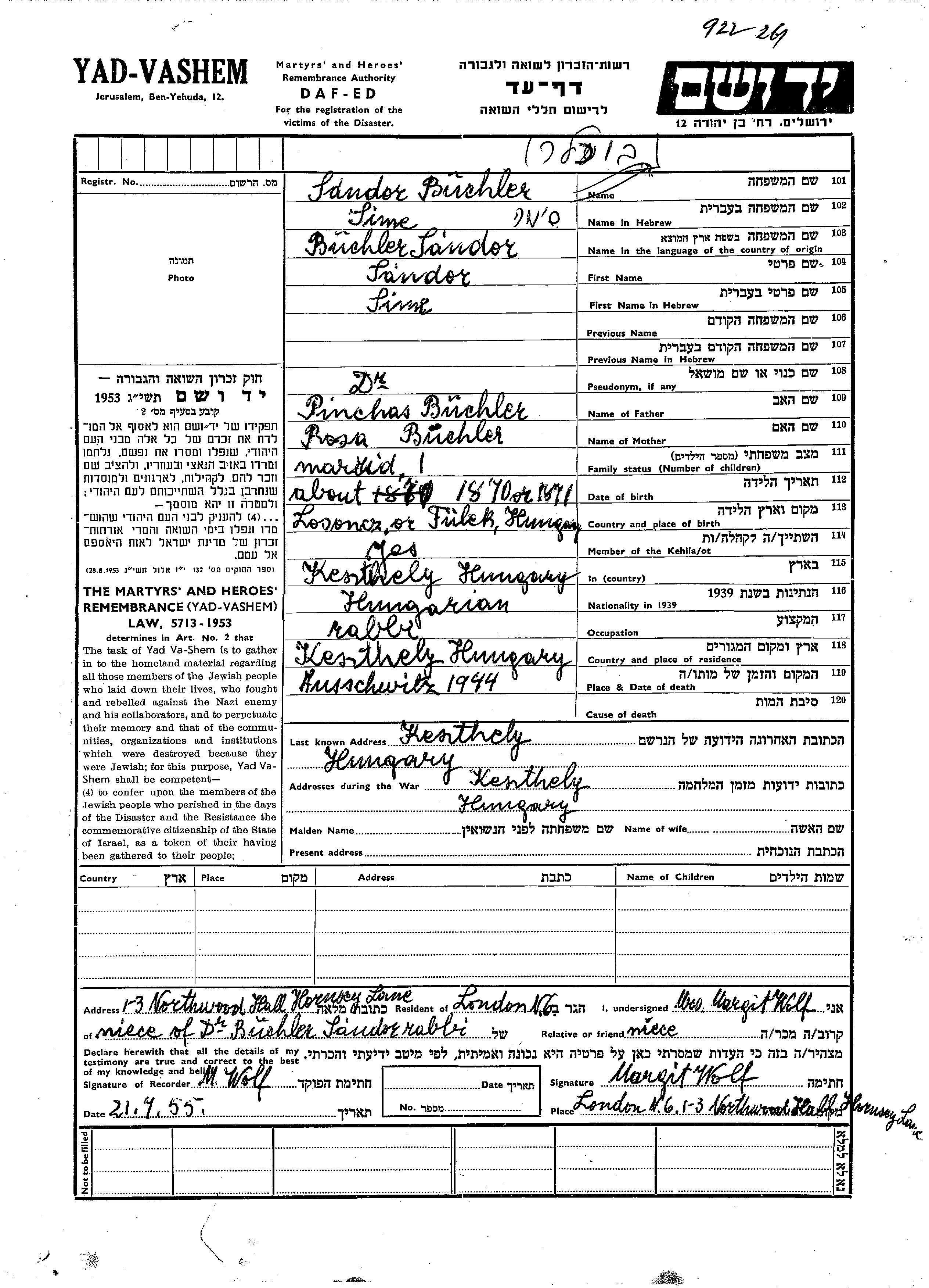 Sime Sima Buchler, geb. Sandor wurde im Jahr 1870 in Losoncz, Tschechoslowakei geboren. Sie war die Tochter von Pinchas und Rosa. Sie war Kaufmann/-frau und Verheiratet. Vor dem Zweiten Weltkrieg lebte sie in Keszthely, Ungarn. Während des Krieges war sie in Keszthely, Ungarn.